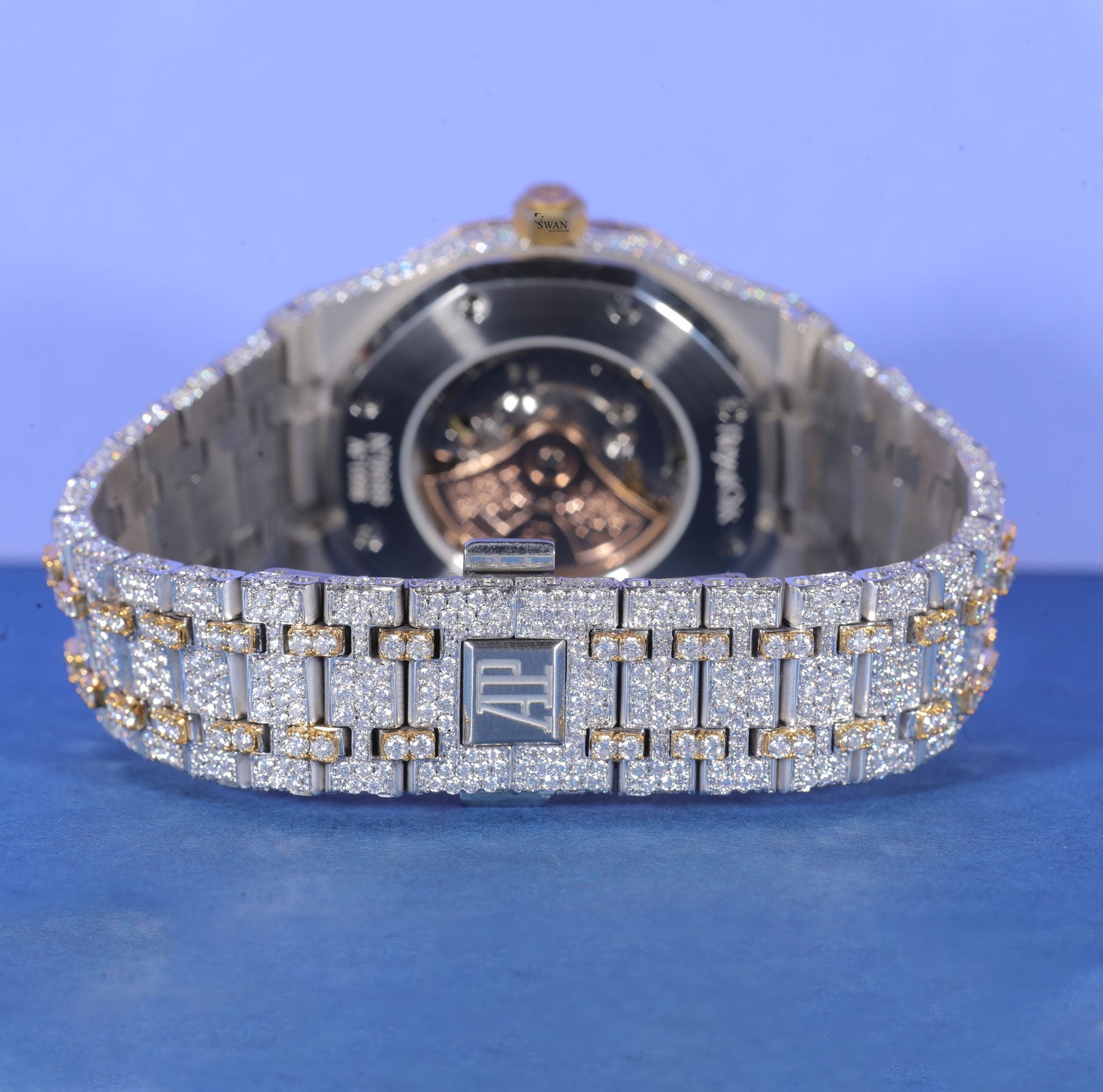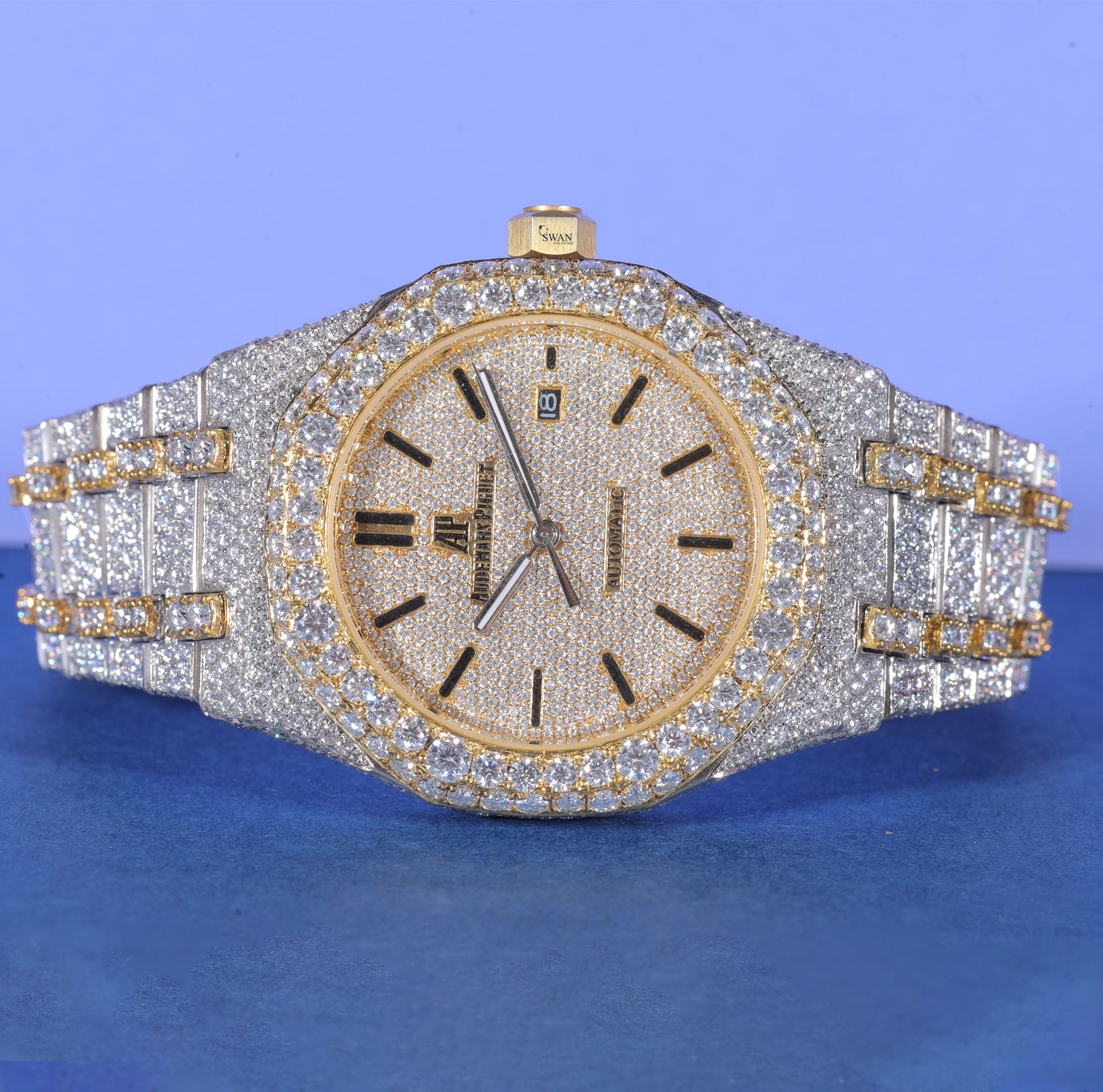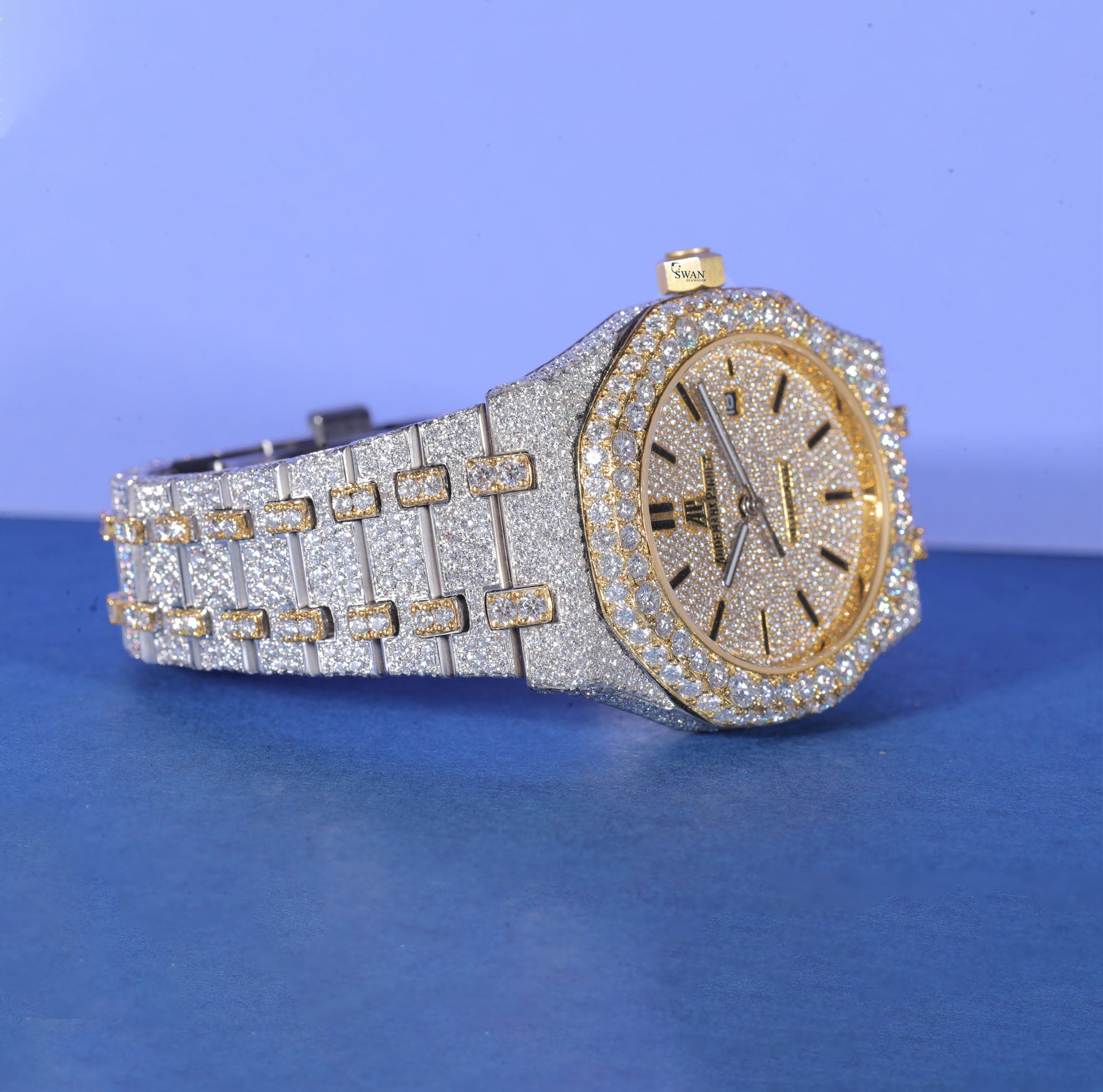Fully Iced Out Gold Bezel Luxury Watch with Moissanite Diamonds and Silver-Gold Bracelet – Men’s Premium Timepiece SwanDiamond