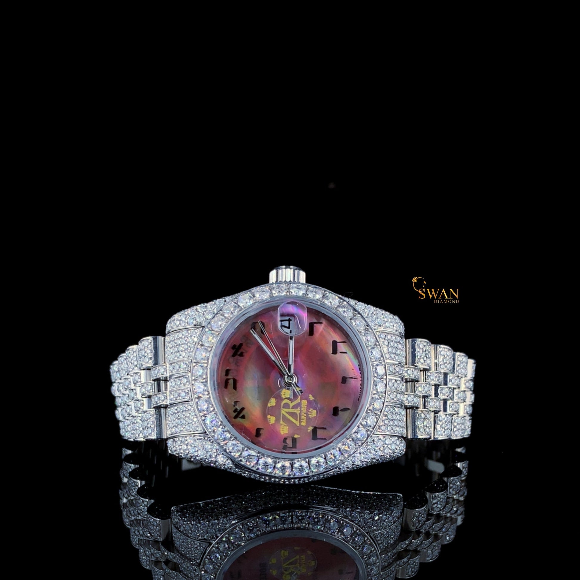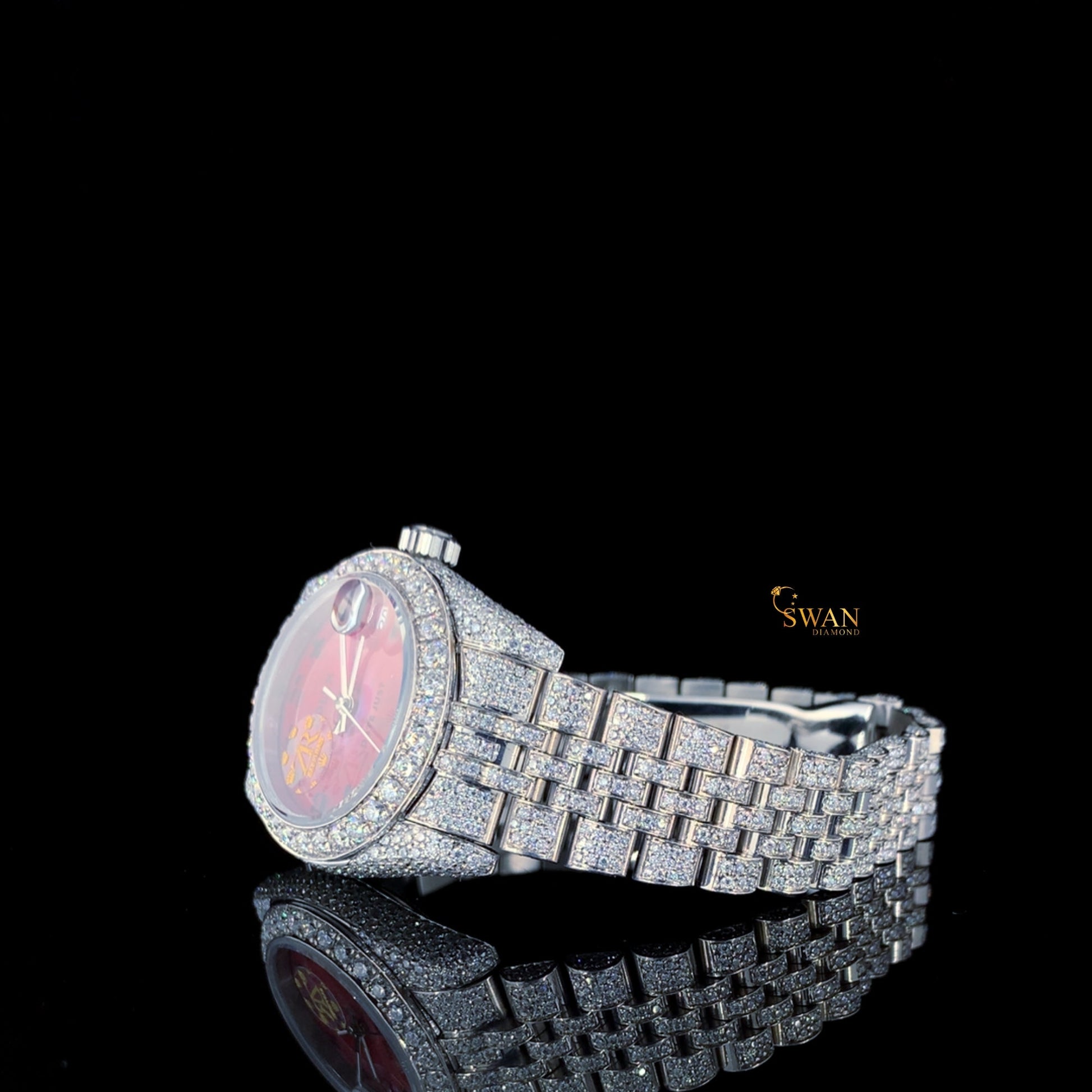 Iced Out Diamond Watch with Red Mother of Pearl Dial Fully Paved Bracelet Luxury Timepiece SwanDiamond