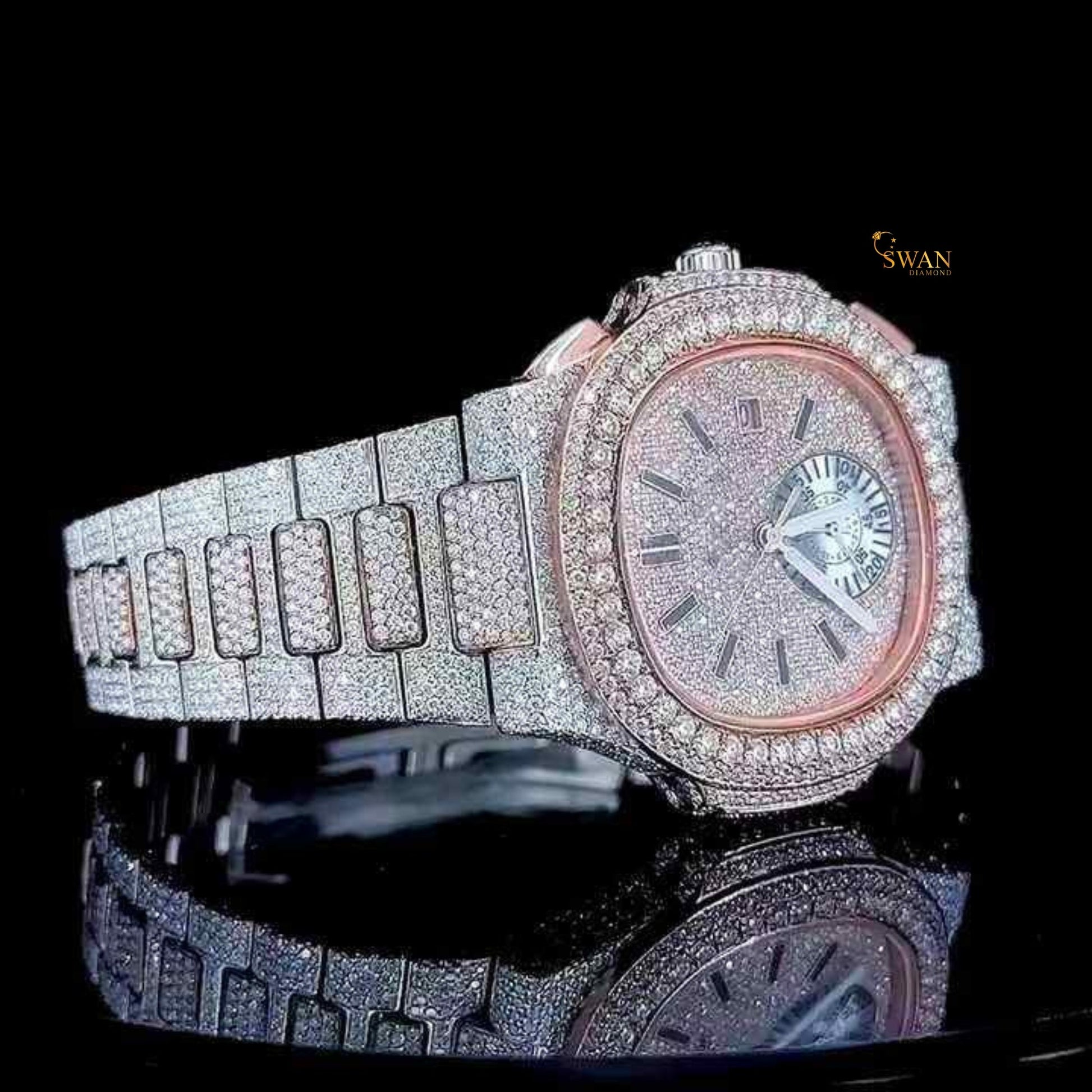 Luxury Iced Out Diamond Watch with Rose Gold Outline Pave Dial Date Display Full Diamond Bracelet and Large Bezel Stones SwanDiamond