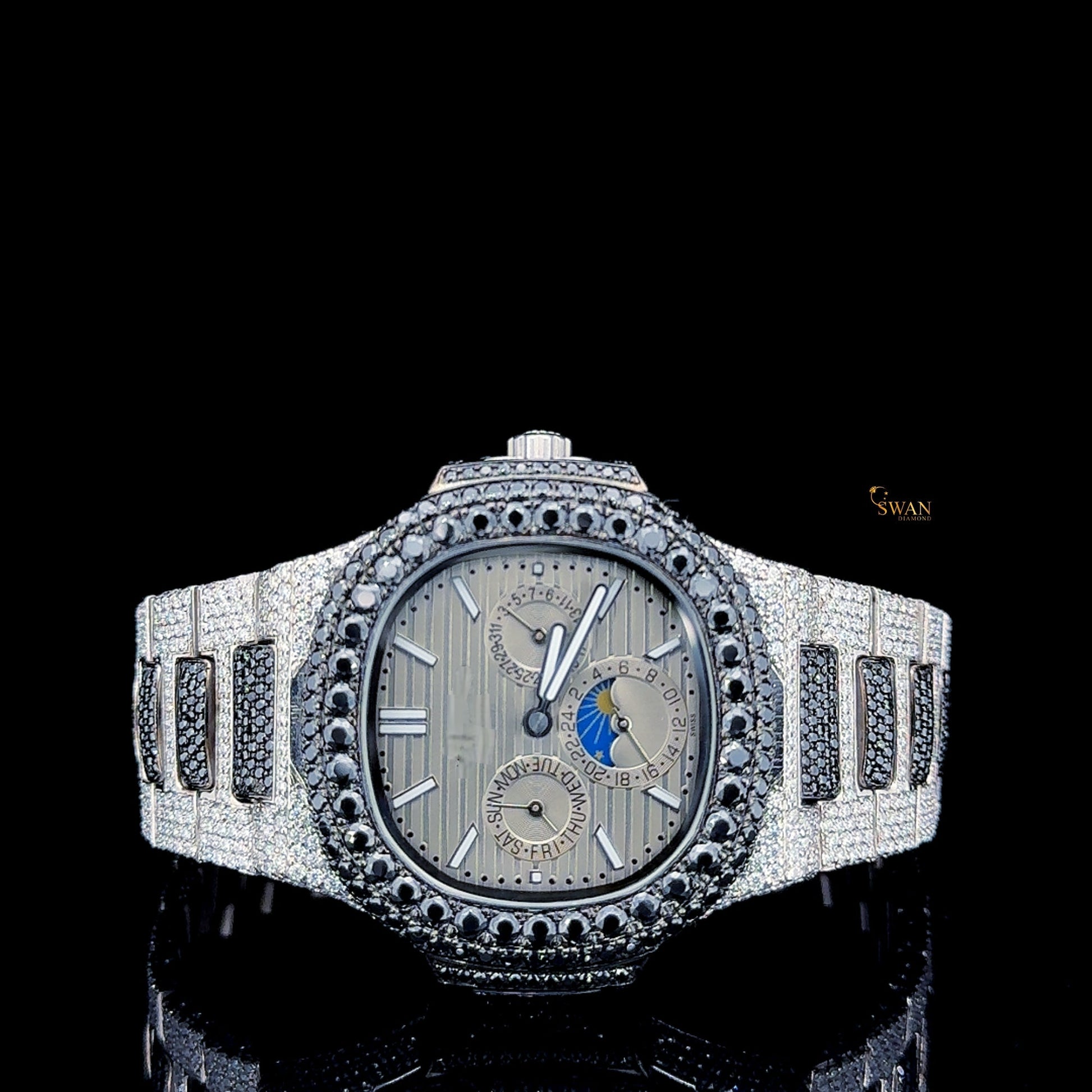 Mens Black Diamond Watch Luxury Iced Out Silver Bracelet Fully Paved Custom Hip Hop Jewelry Two Tone Timepiece SwanDiamond