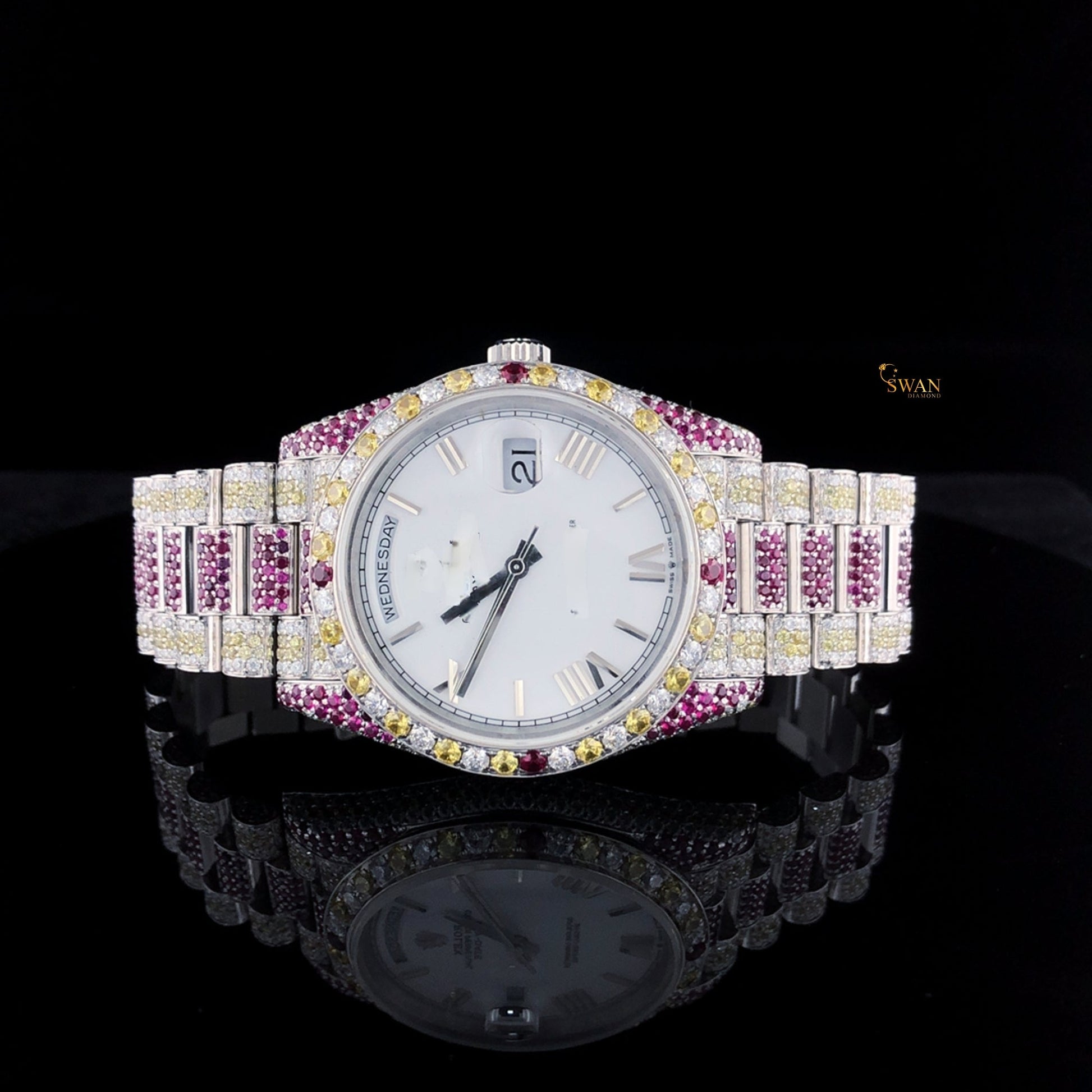 Mens Multicolor Diamond Watch Iced Out Ruby and Yellow Accents White Dial Custom Luxury Hip Hop Jewelry Bracelet SwanDiamond