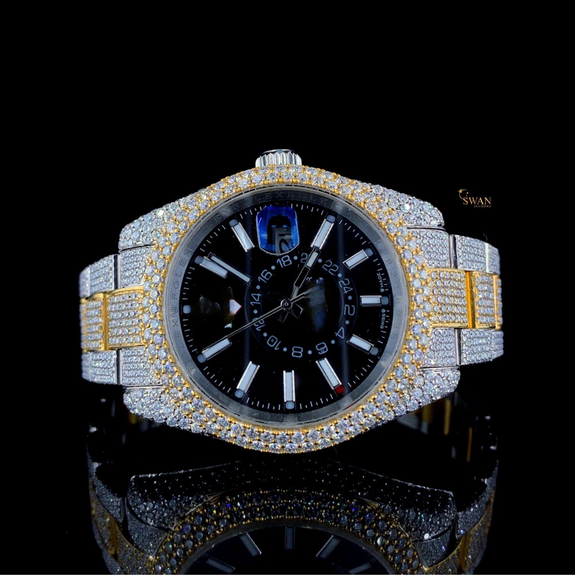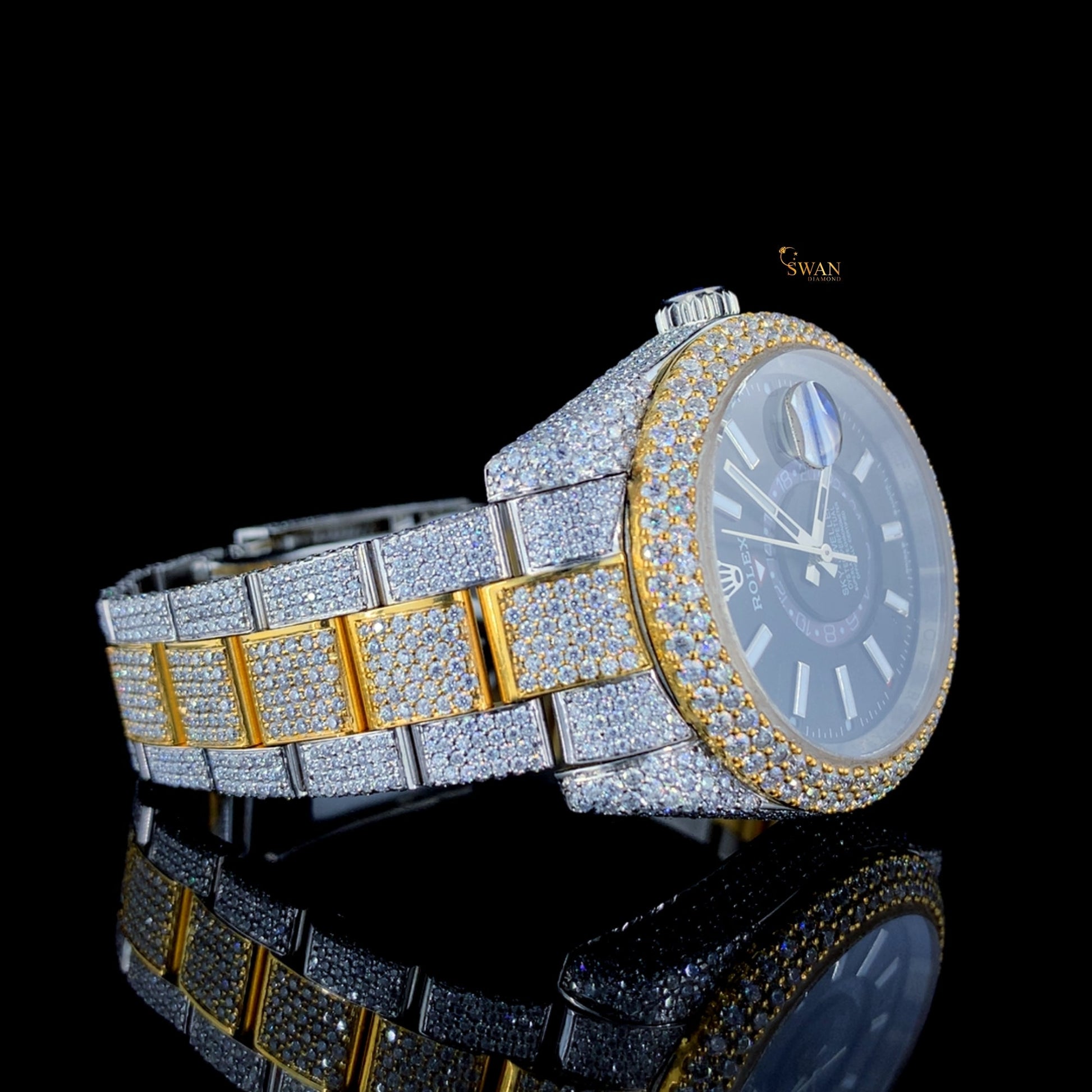 Mens Two Tone Diamond Watch Iced Out Black Dial Luxury Custom Fully Paved Bracelet Hip Hop Jewelry Timepiece SwanDiamond