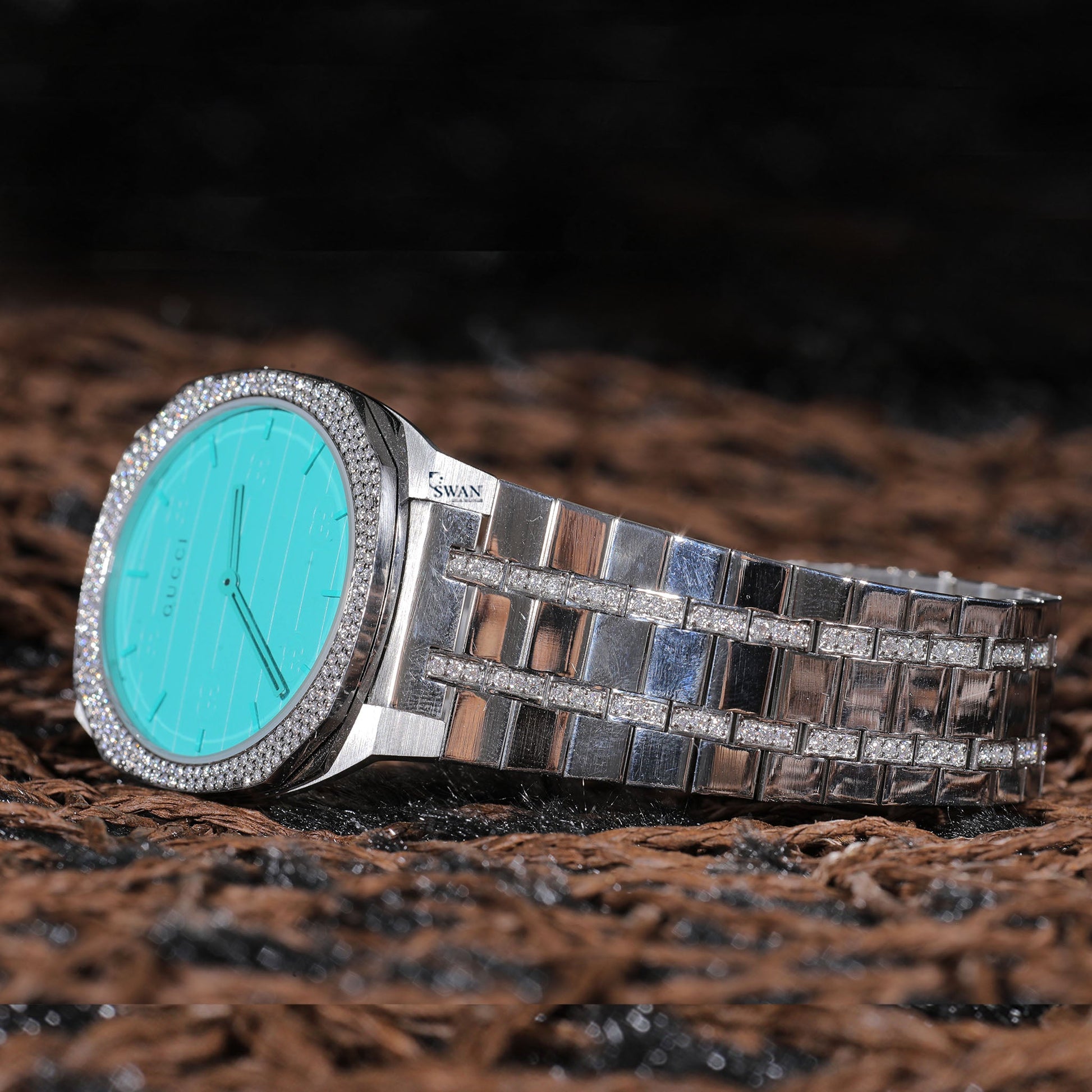 Silver Luxury Watch with Aqua Blue Dial, Diamond Bezel, Pave Link Bracelet, and Sleek Contemporary Design SwanDiamond