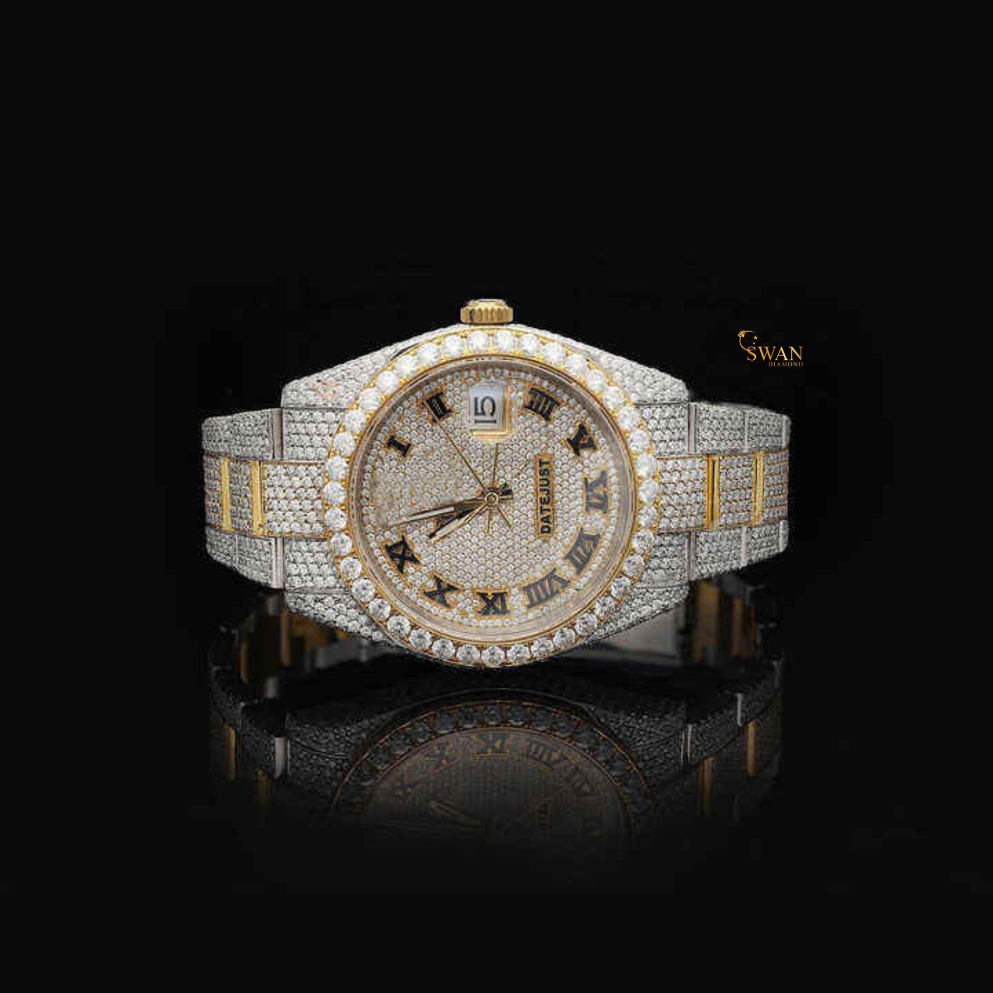 Two Tone Diamond Watch Fully Iced Out Gold and Silver Bracelet with Roman Numeral Dial Luxury Custom Timepiece SwanDiamond