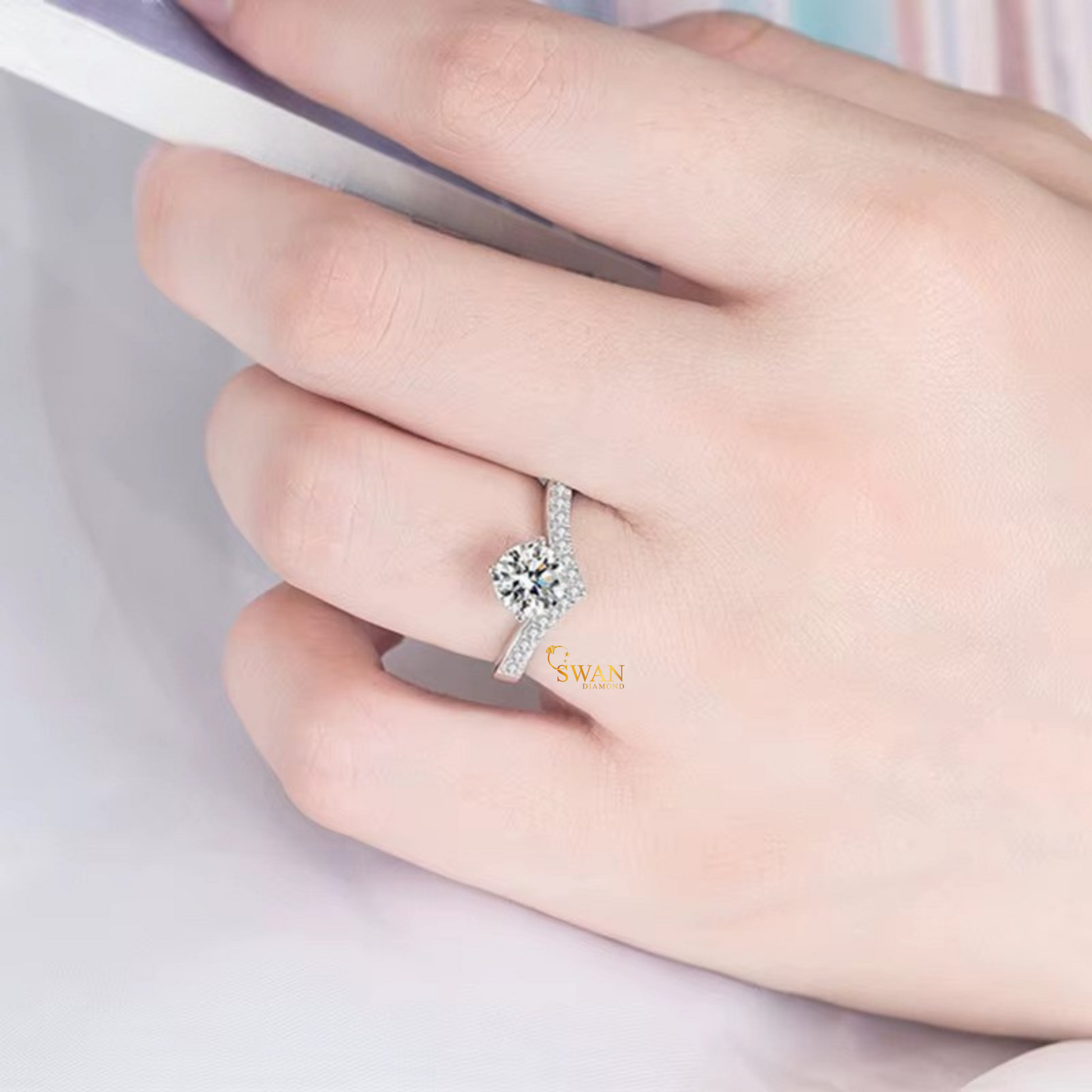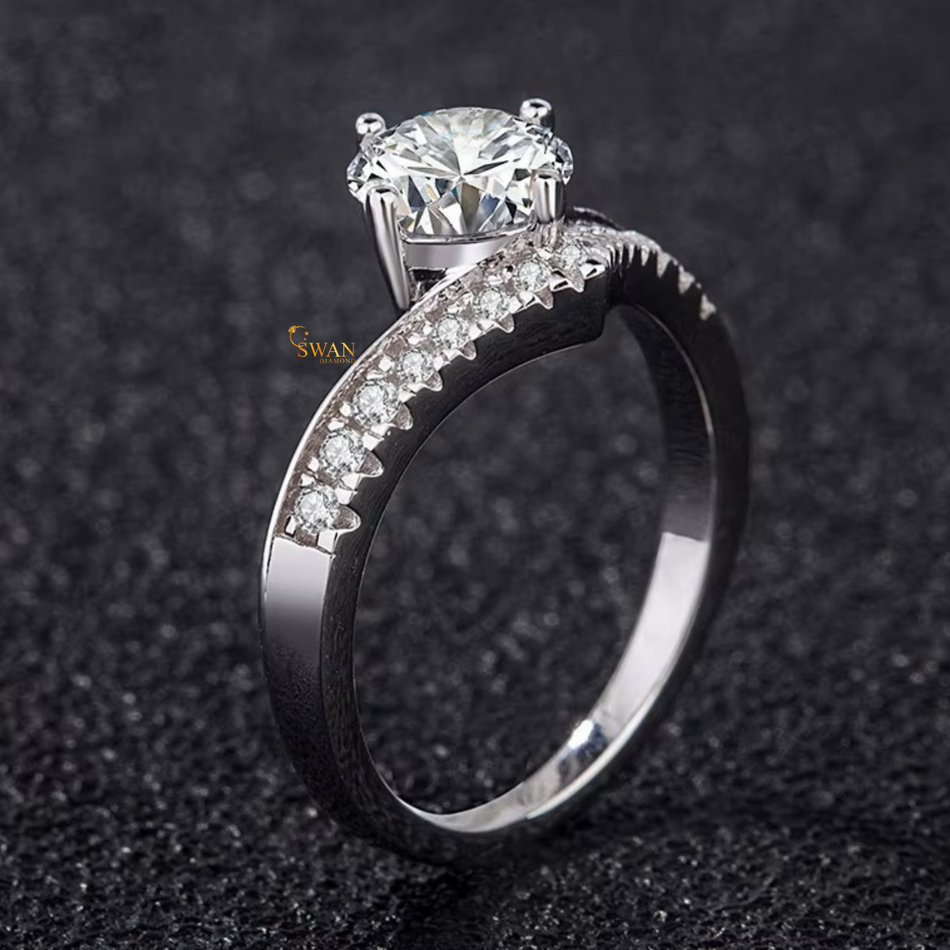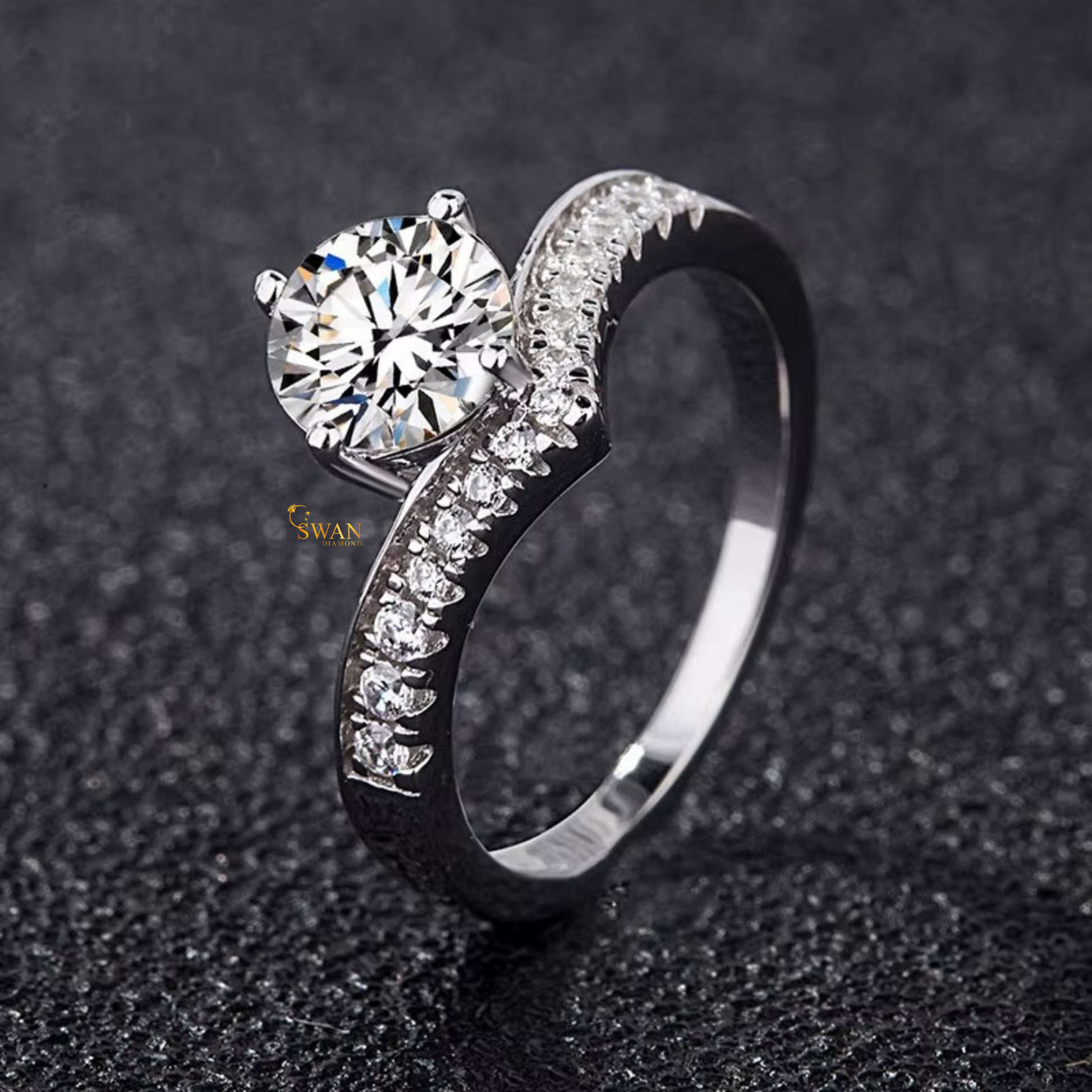 Round Cut Diamond Solitaire Engagement Ring 925 Silver Chevron Pavé Band Elegant Modern Bridal Jewelry Gift swandiamond