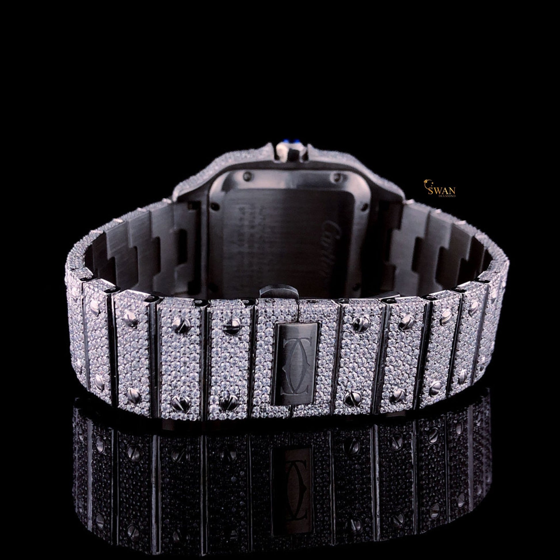 Cartier Santos Diamond Watch with Full Pave Setting and Red Hour Markers Custom Luxury Iced Out Timepiece by SwanDiamond