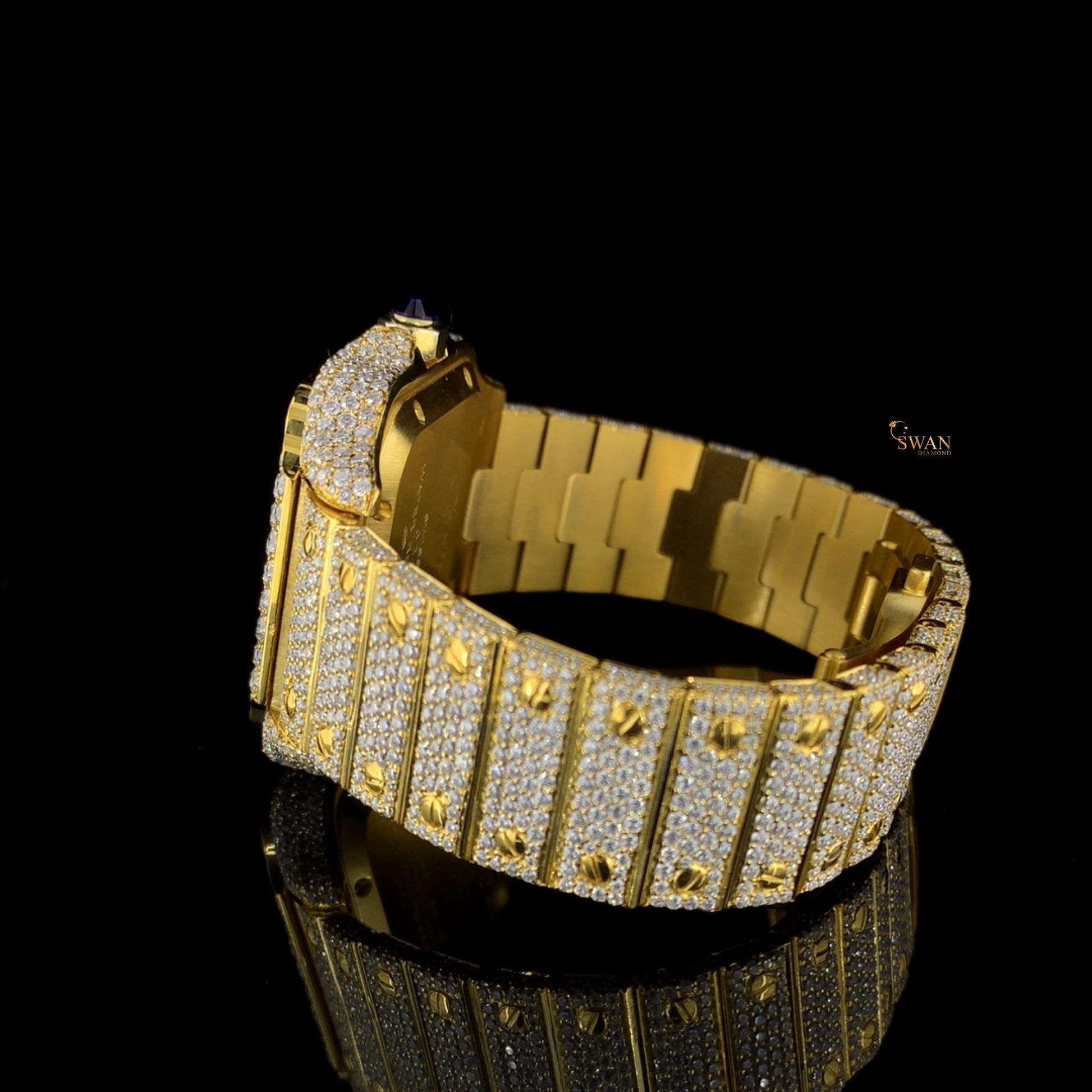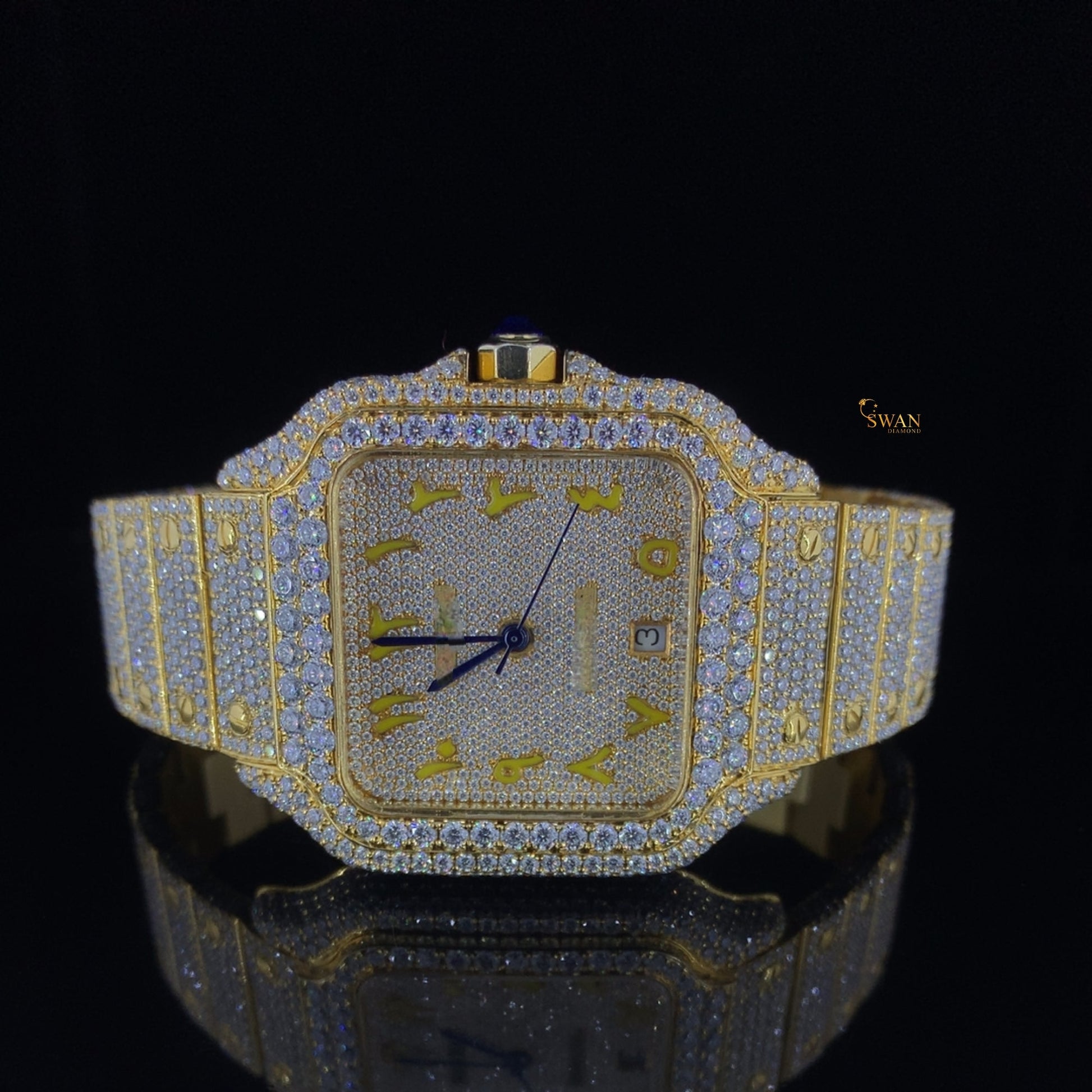 Custom Cartier Santos Diamond Watch Fully Iced Out Yellow Gold Arabic Dial Luxury Mens Timepiece SwanDiamond
