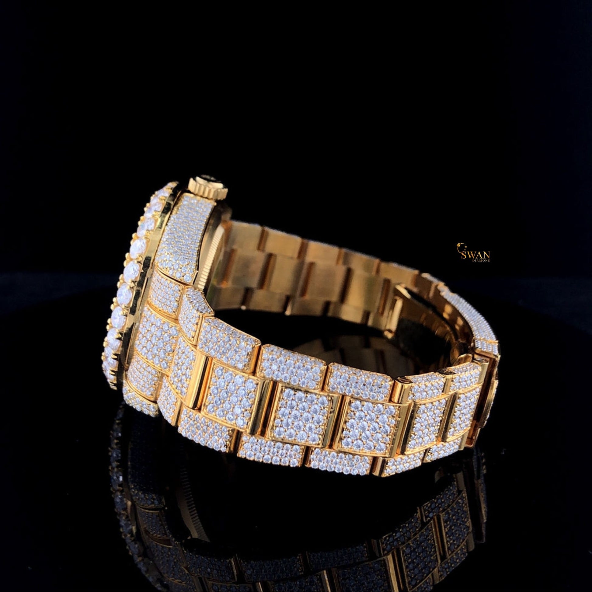 Custom Rolex Sky Dweller Diamond Watch Fully Iced Out Yellow Gold Luxury Mens Timepiece with Round Bezel SwanDiamond