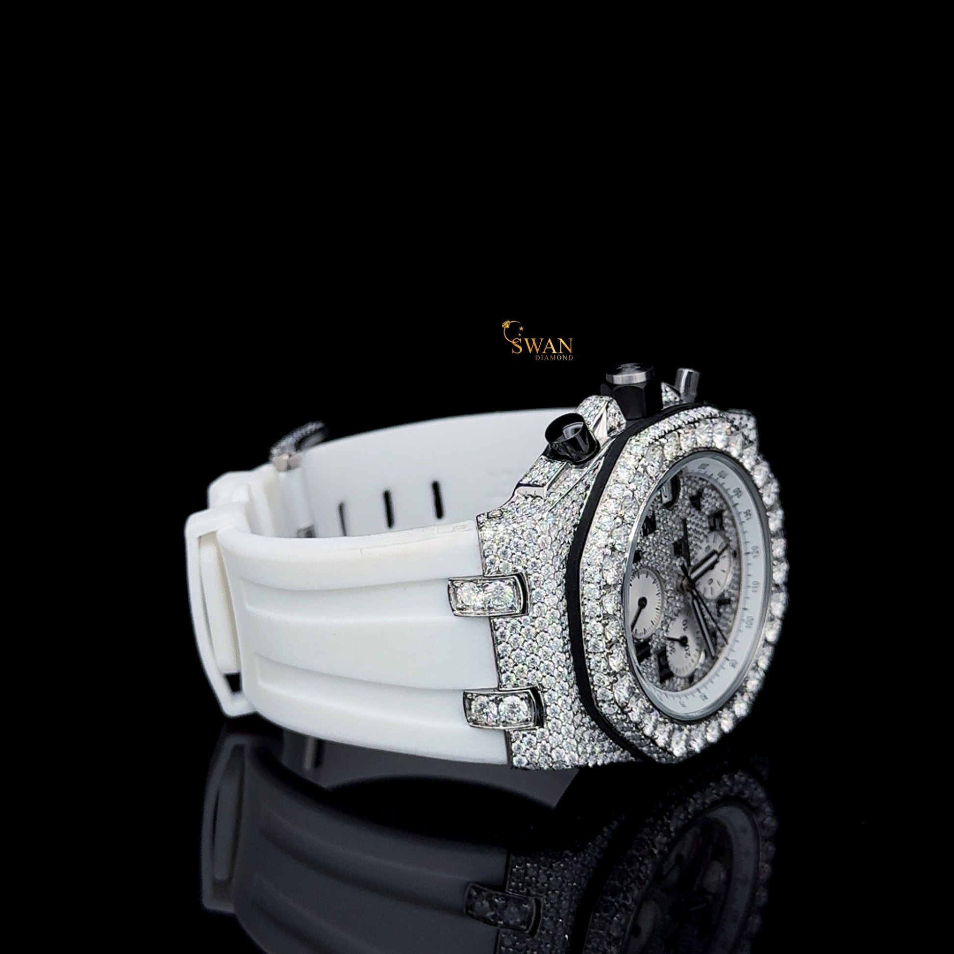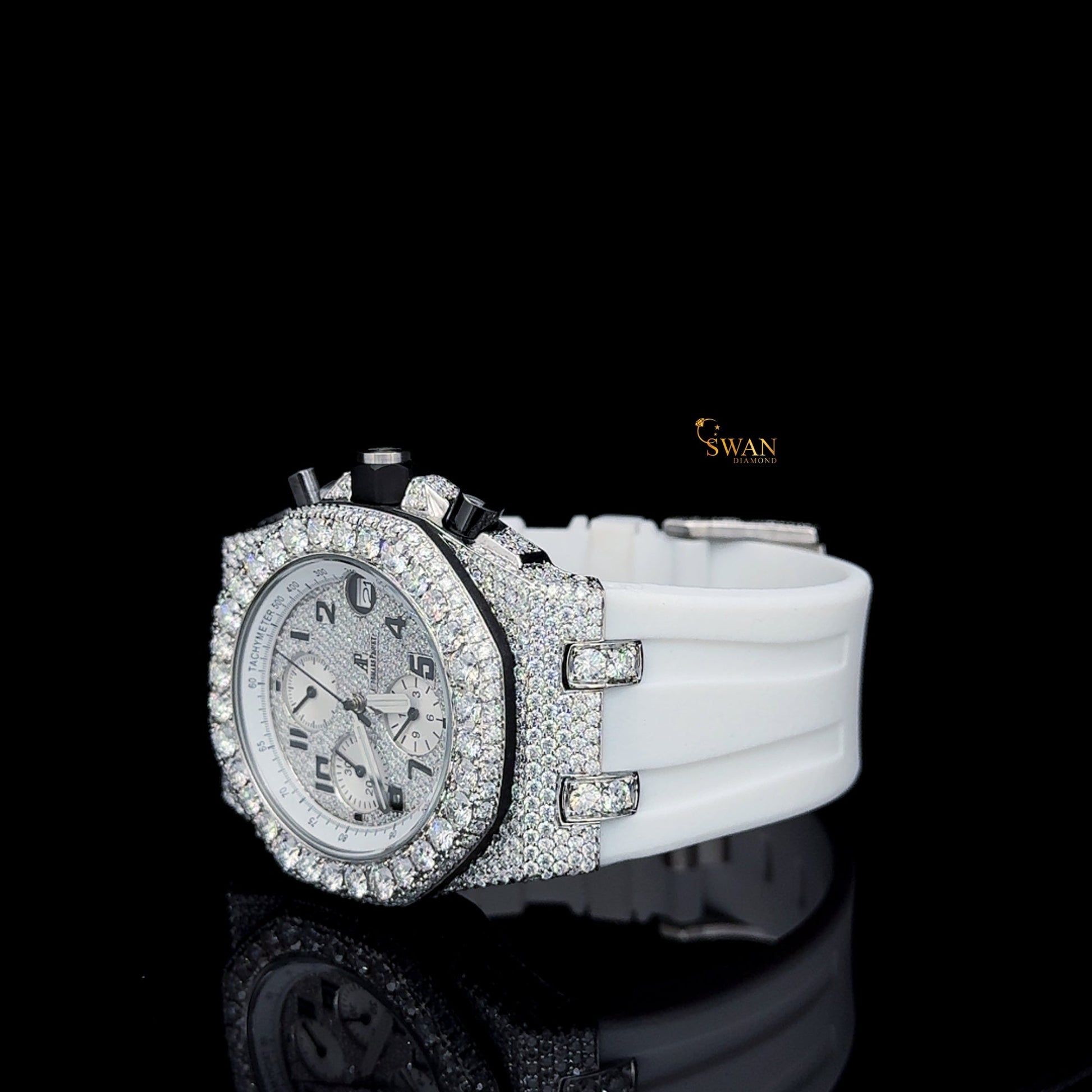 Designer Iced Out Diamond Chronograph Watch with White Strap Silver Dial Luxury Full Pave Bezel Unisex SwanDiamond