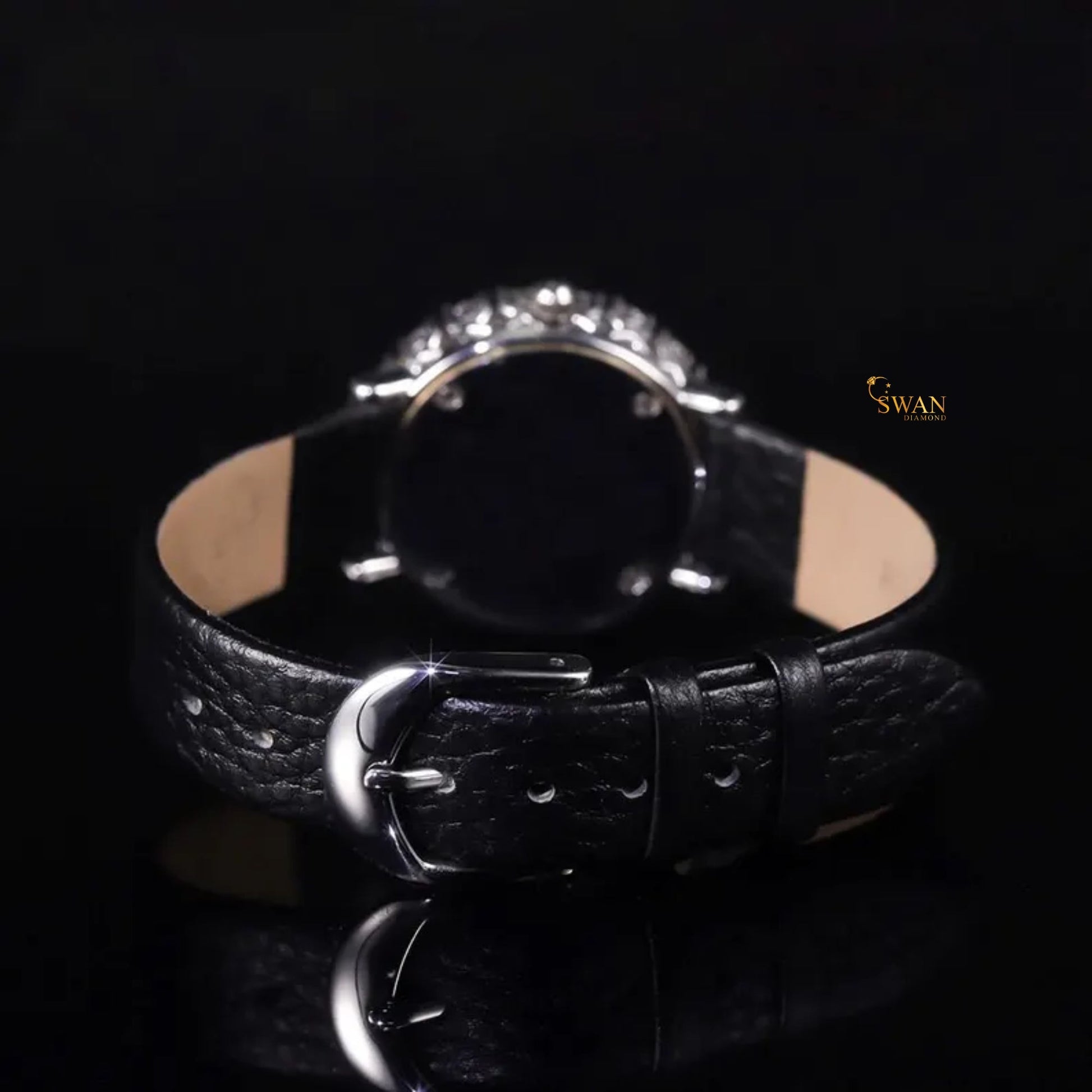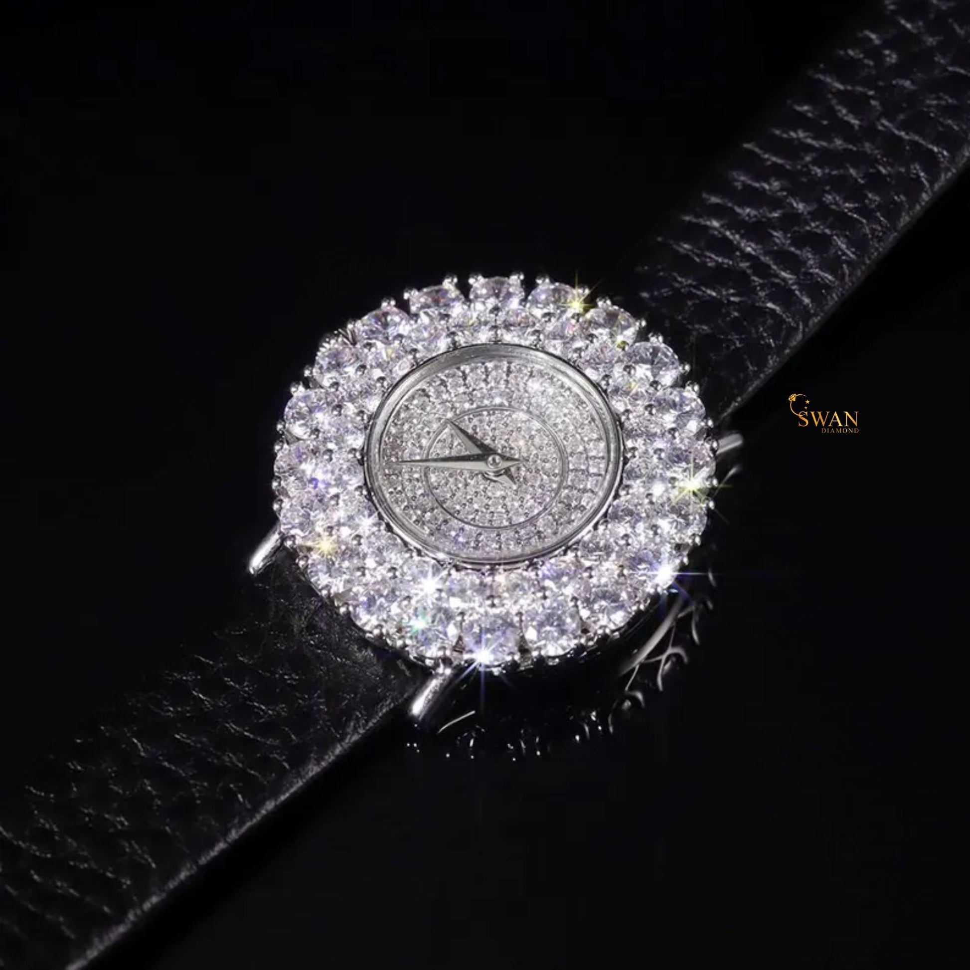 Elegant Ladies Diamond Watch with Black Leather Strap Round Halo Bezel Full Pave Dial Luxury Sparkling Timepiece Classic Style SwanDiamond