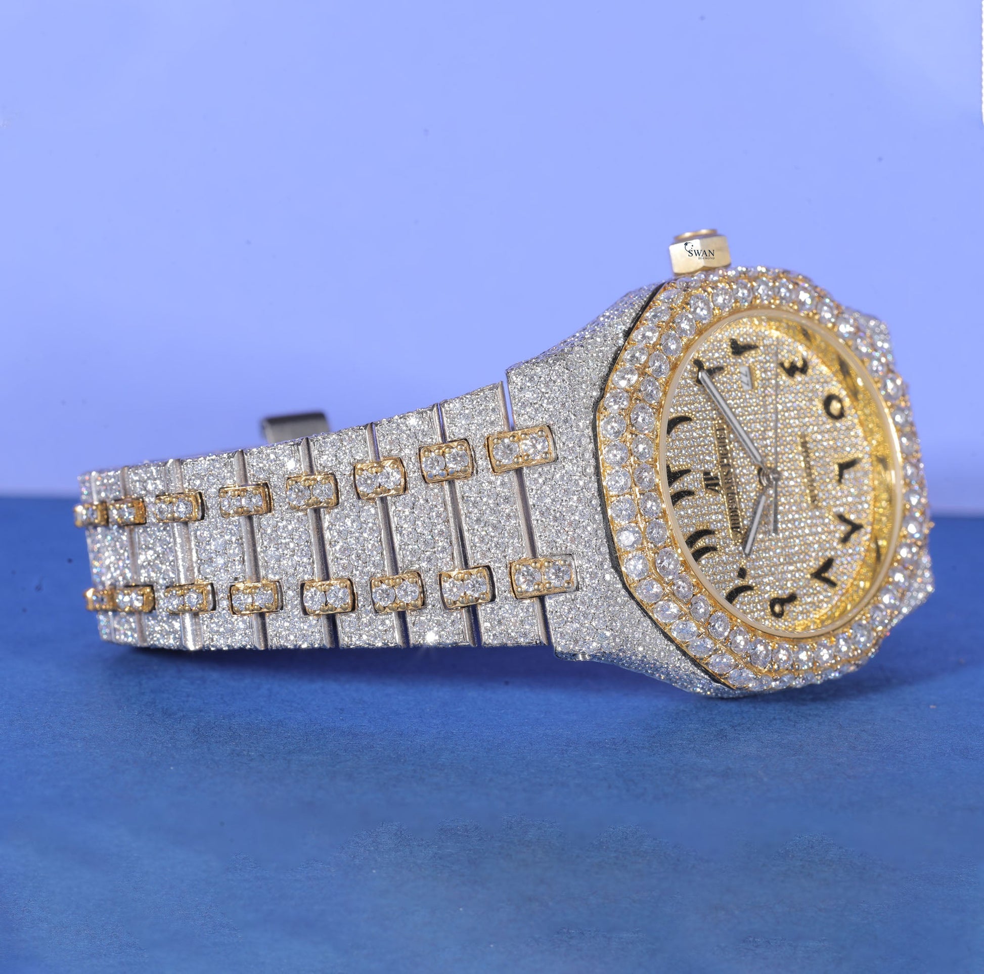 Luxury Arabic Dial Iced Out Watch Fully Custom Moissanite Diamond Timepiece for Men Two Tone Gold and Silver Bling Watch SwanDiamond