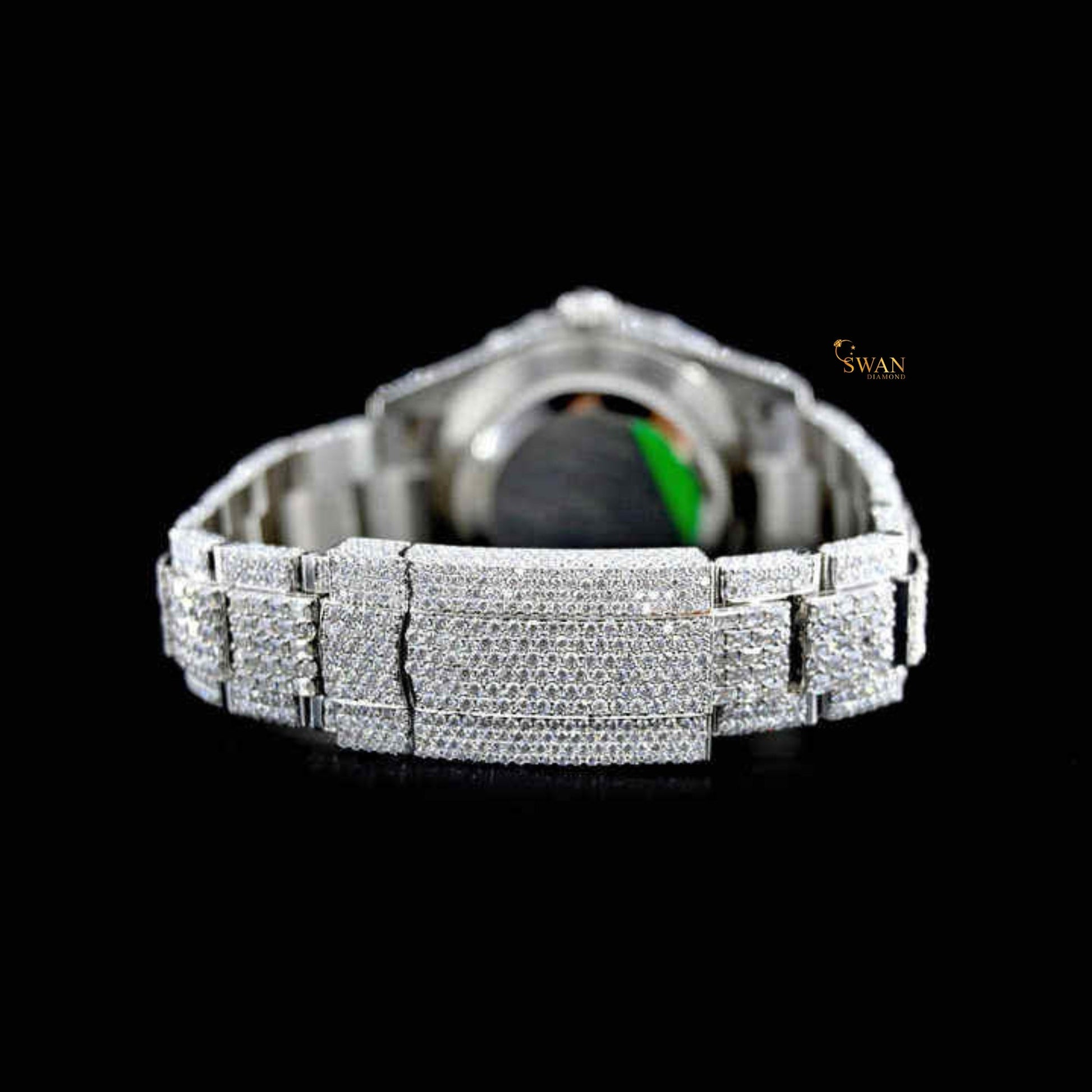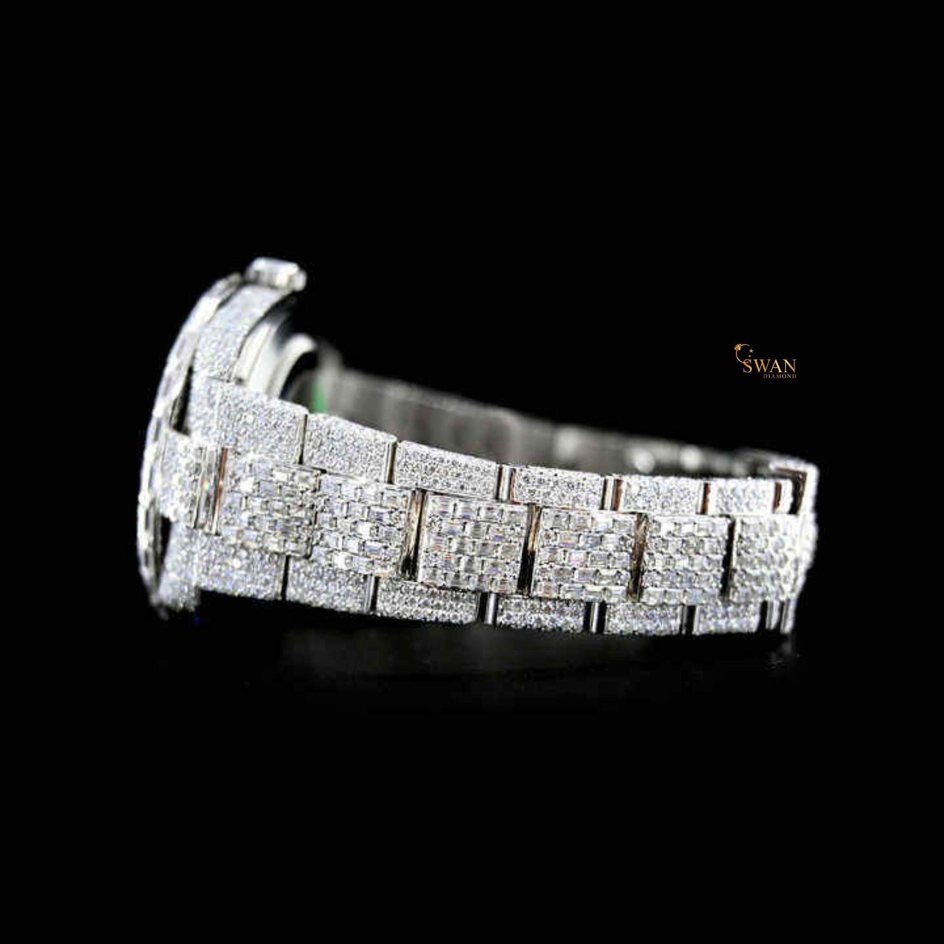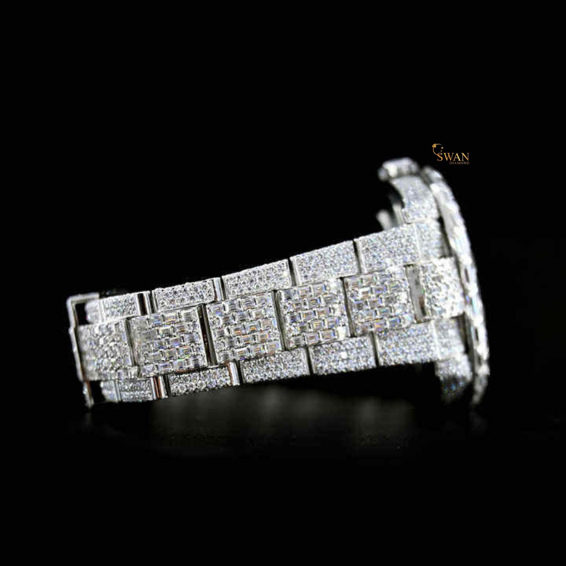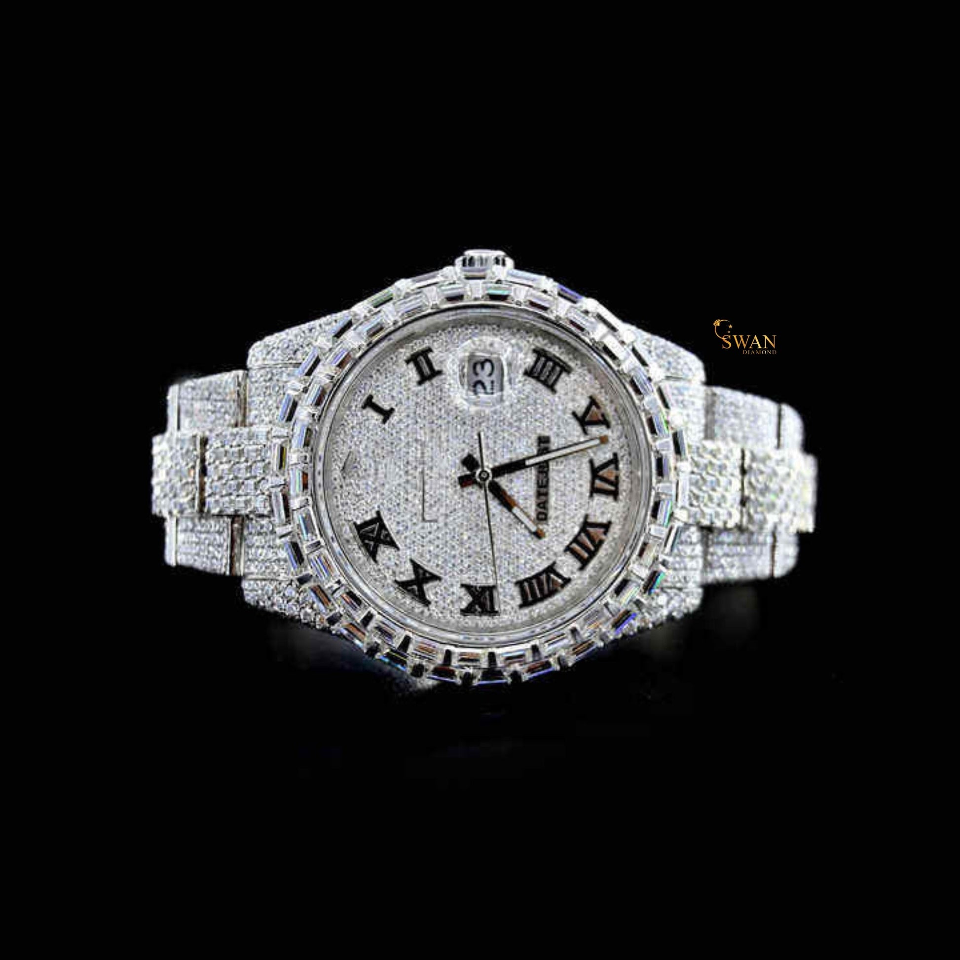 Luxury Fully Iced Out Diamond Watch in White Gold with Roman Numeral Dial and Paved Bracelet Custom Men’s Jewelry Timepiece
