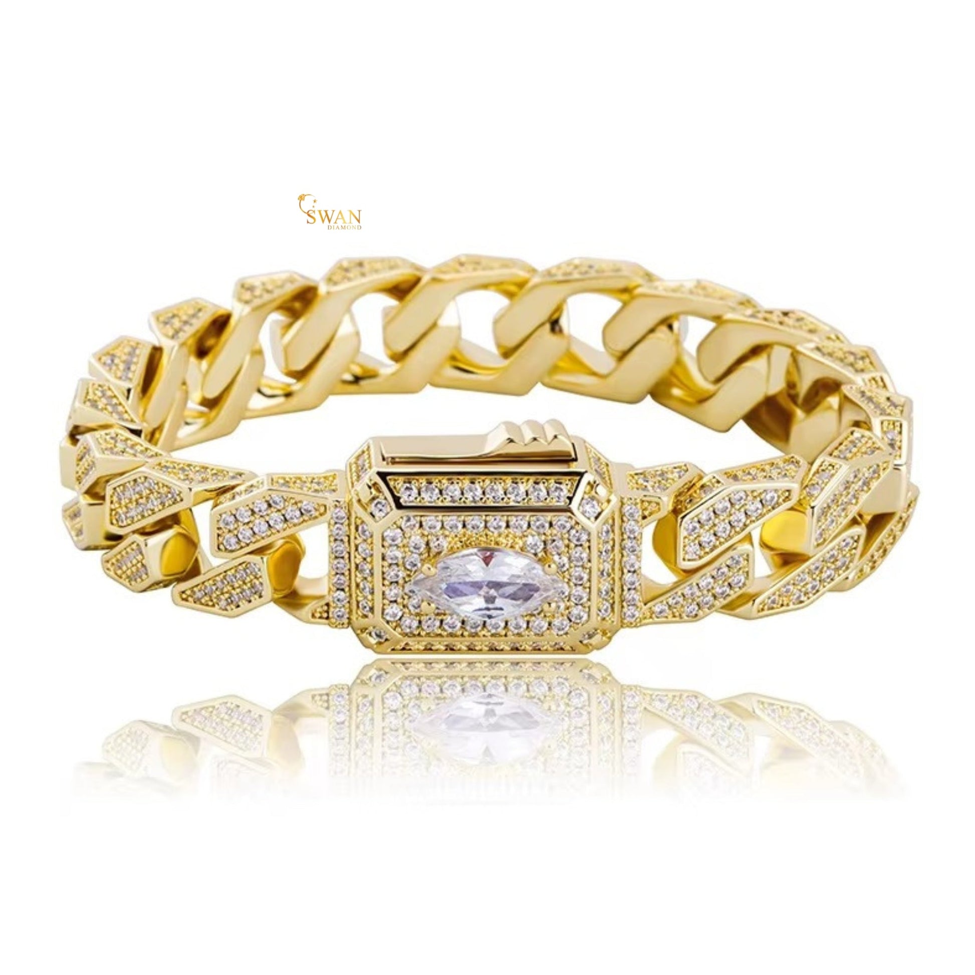 Luxury Gold and Silver Diamond Cuban Link Bracelet with Iced Out Watch Style Clasp High Quality Hip Hop Jewelry for Men and Women swandiamond