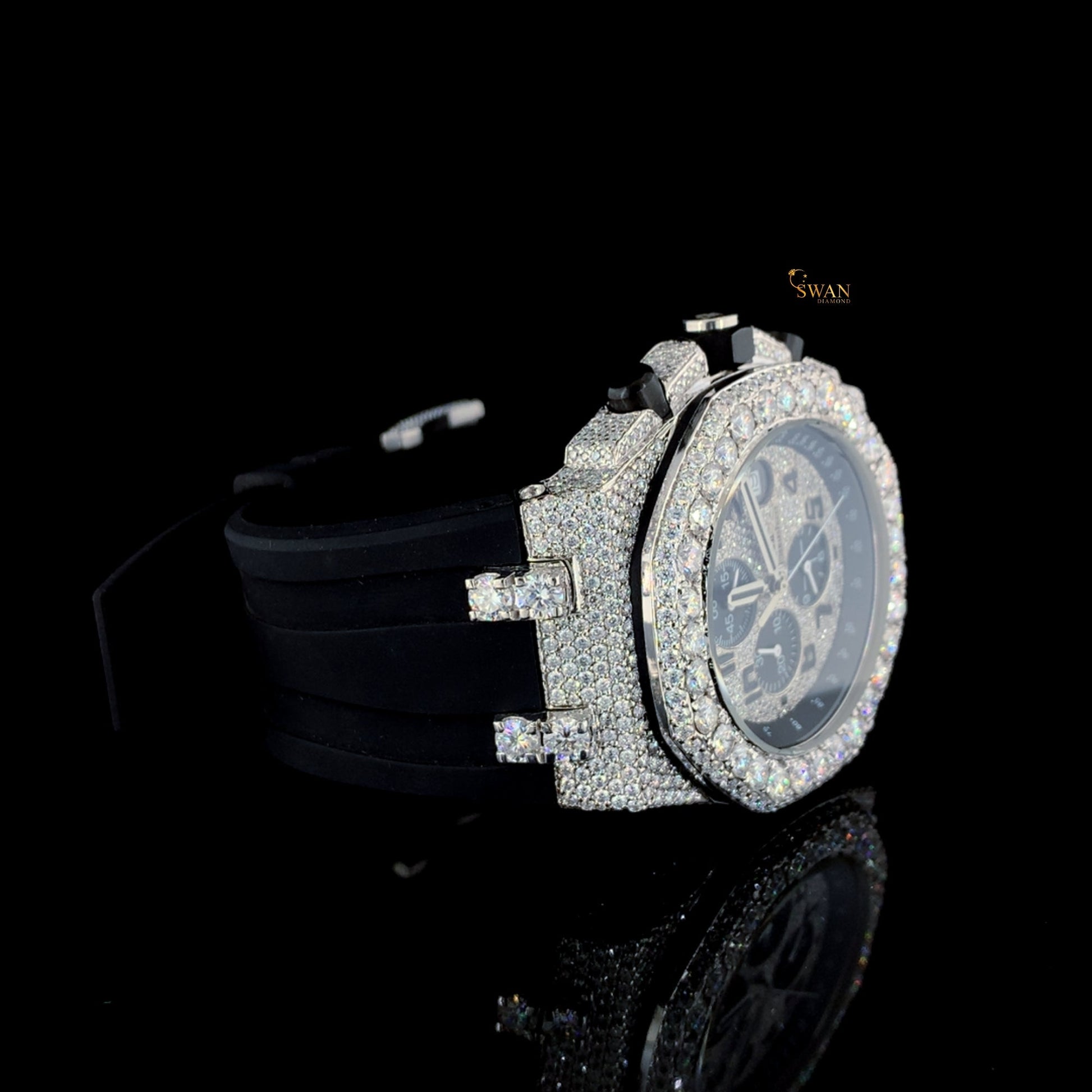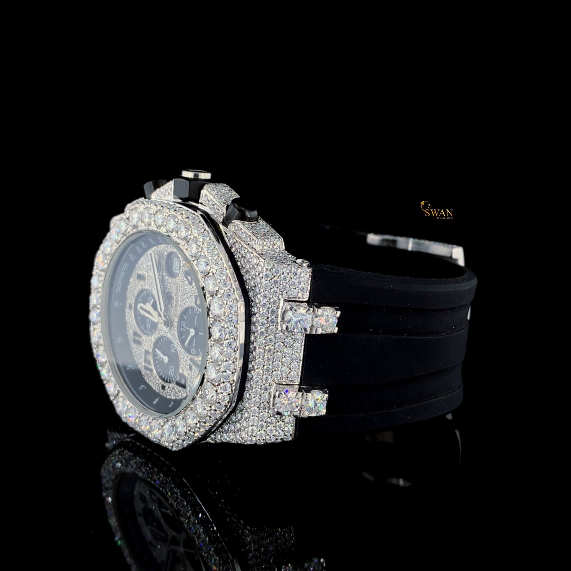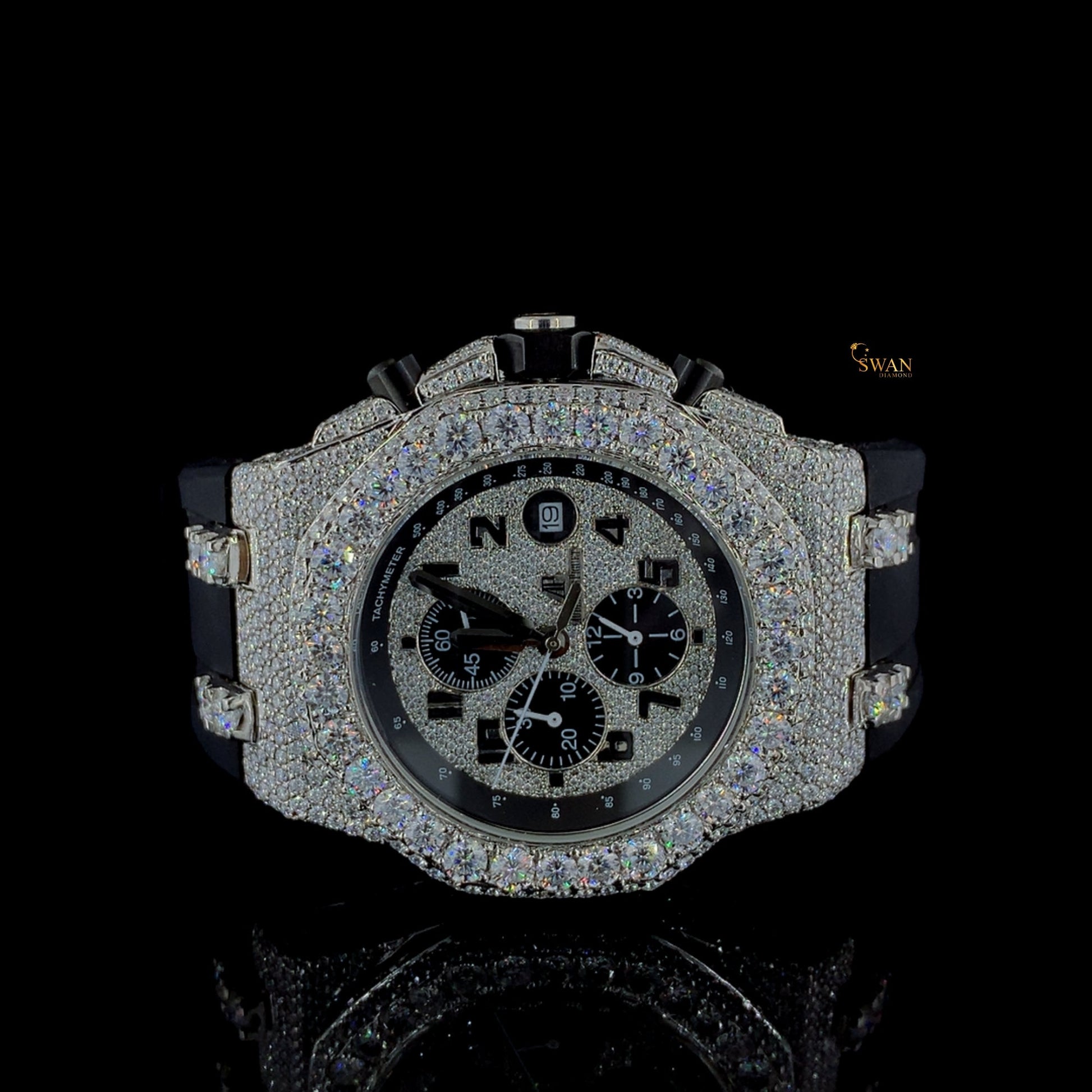 Luxury Iced Out Diamond Chronograph Watch With Black Rubber Strap Mens Hip Hop Bling Fashion Timepiece SwanDiamond