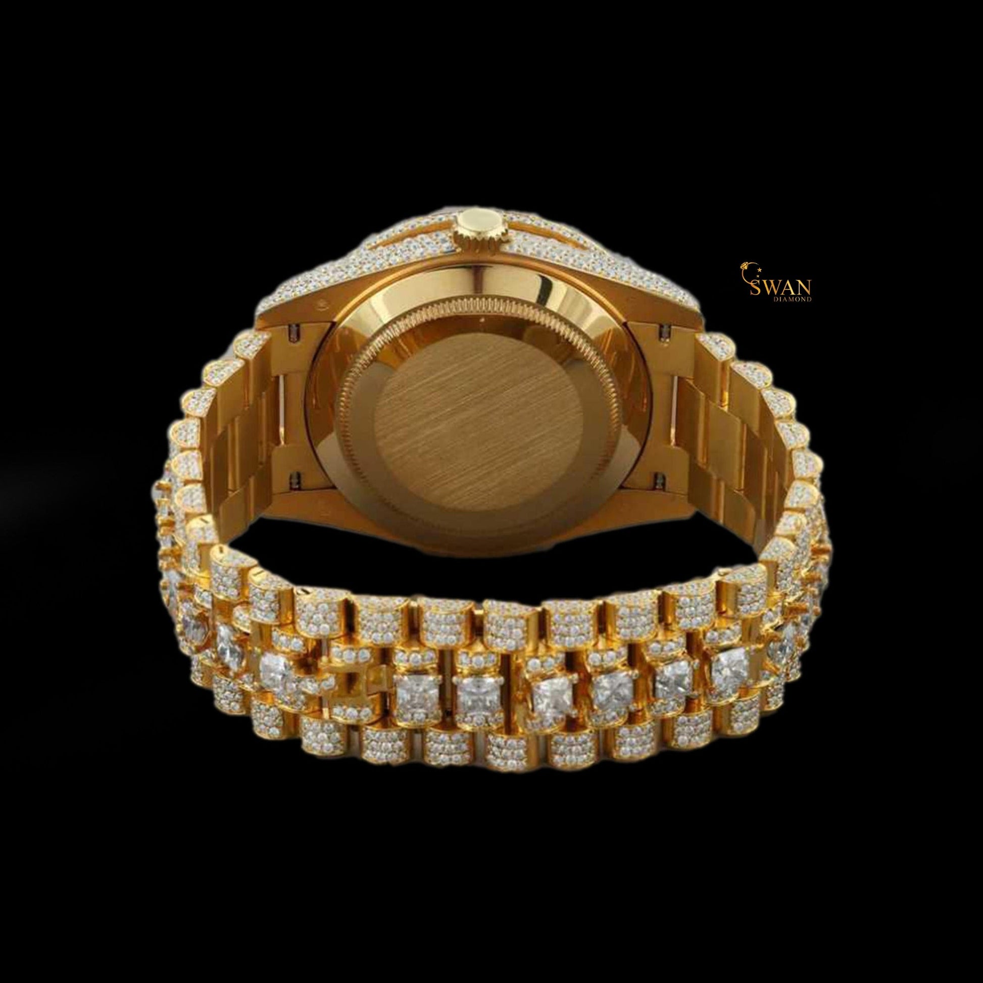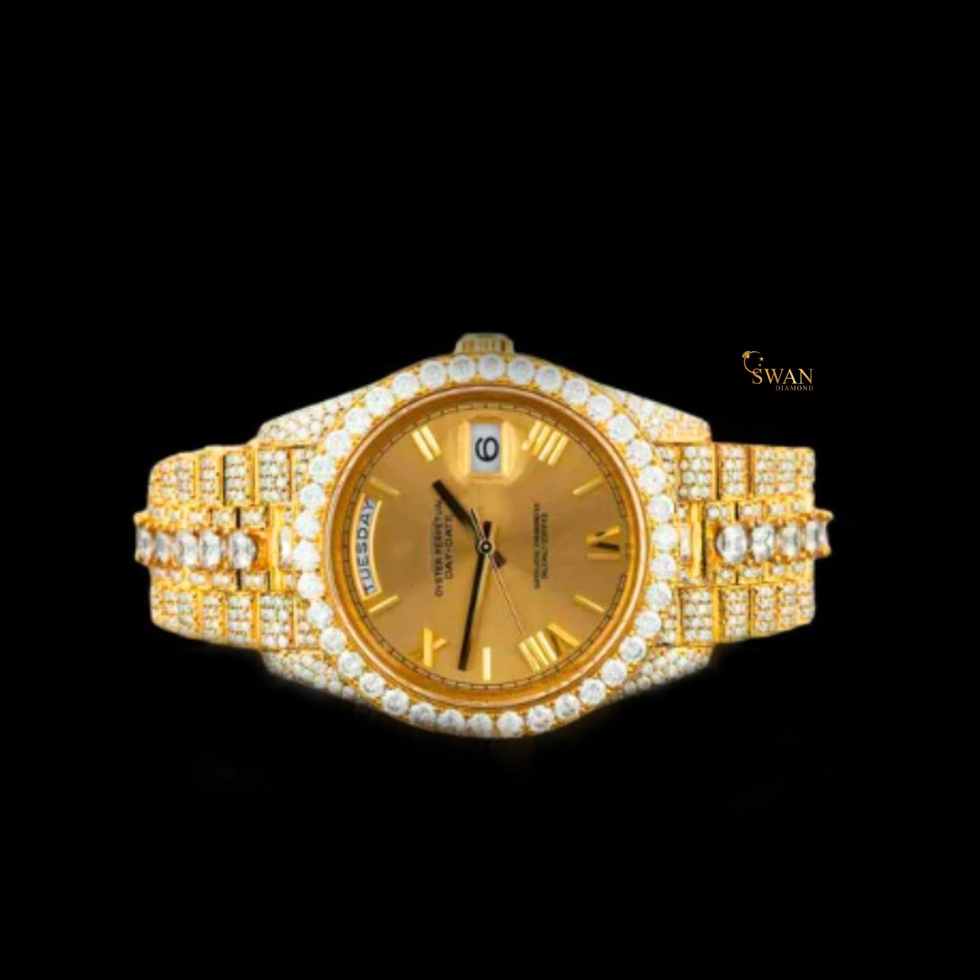 Luxury Iced Out Diamond Watch Gold Day Date Roman Dial Automatic Custom Hip Hop Jewelry Statement Presidential Style Timepiece swan diamond