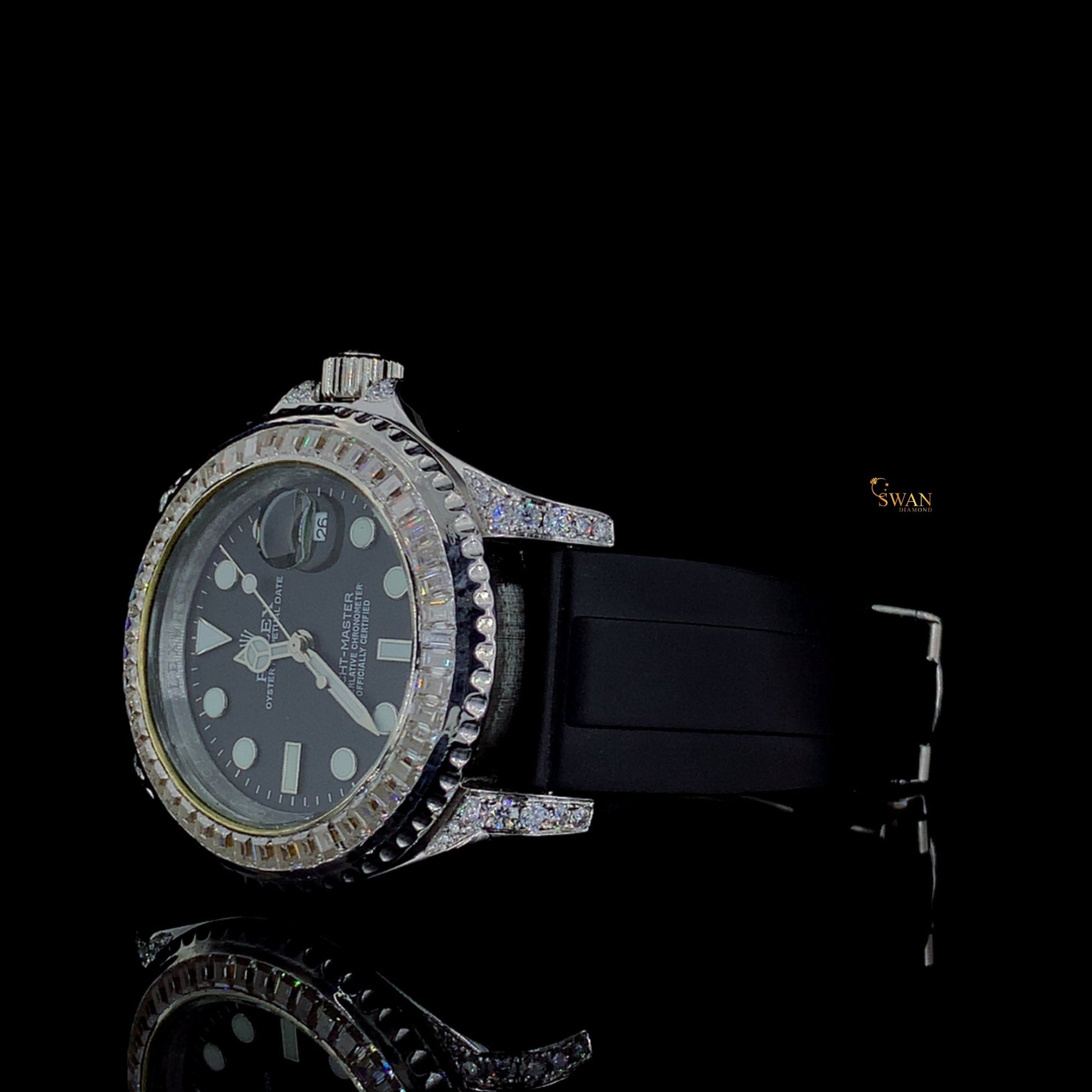 Luxury Rolex Yacht Master Custom Iced Out Watch Black Dial Diamond Bezel Rubber Strap Men’s Jewelry Gift SwanDiamond