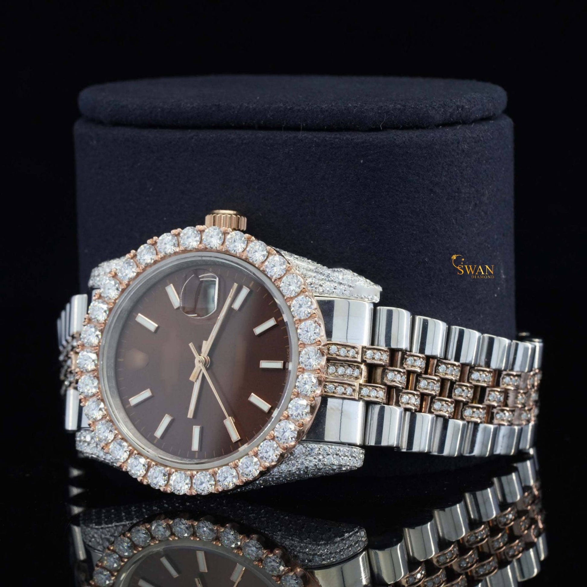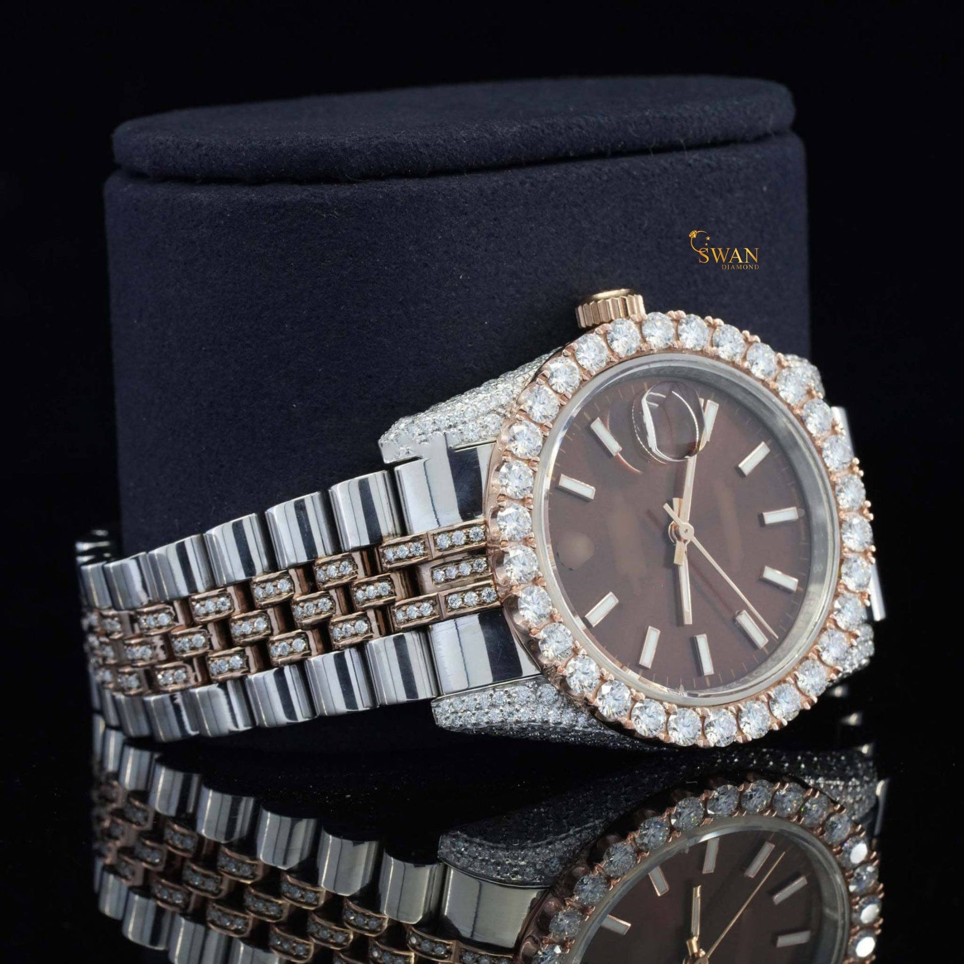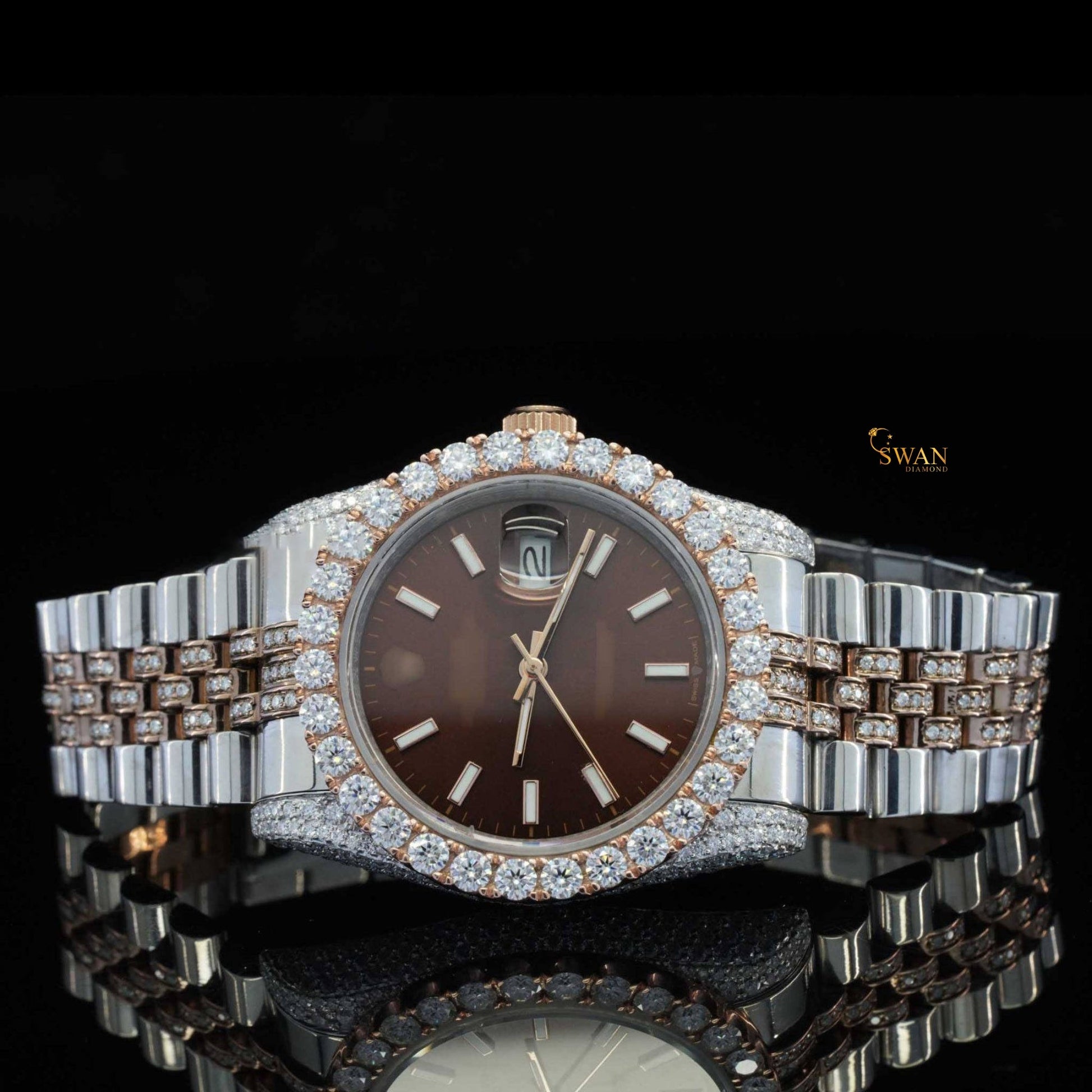 Rose gold and silver-toned iced-out watch with a brown dial a diamond encrusted bezel and a link band by swandiamond