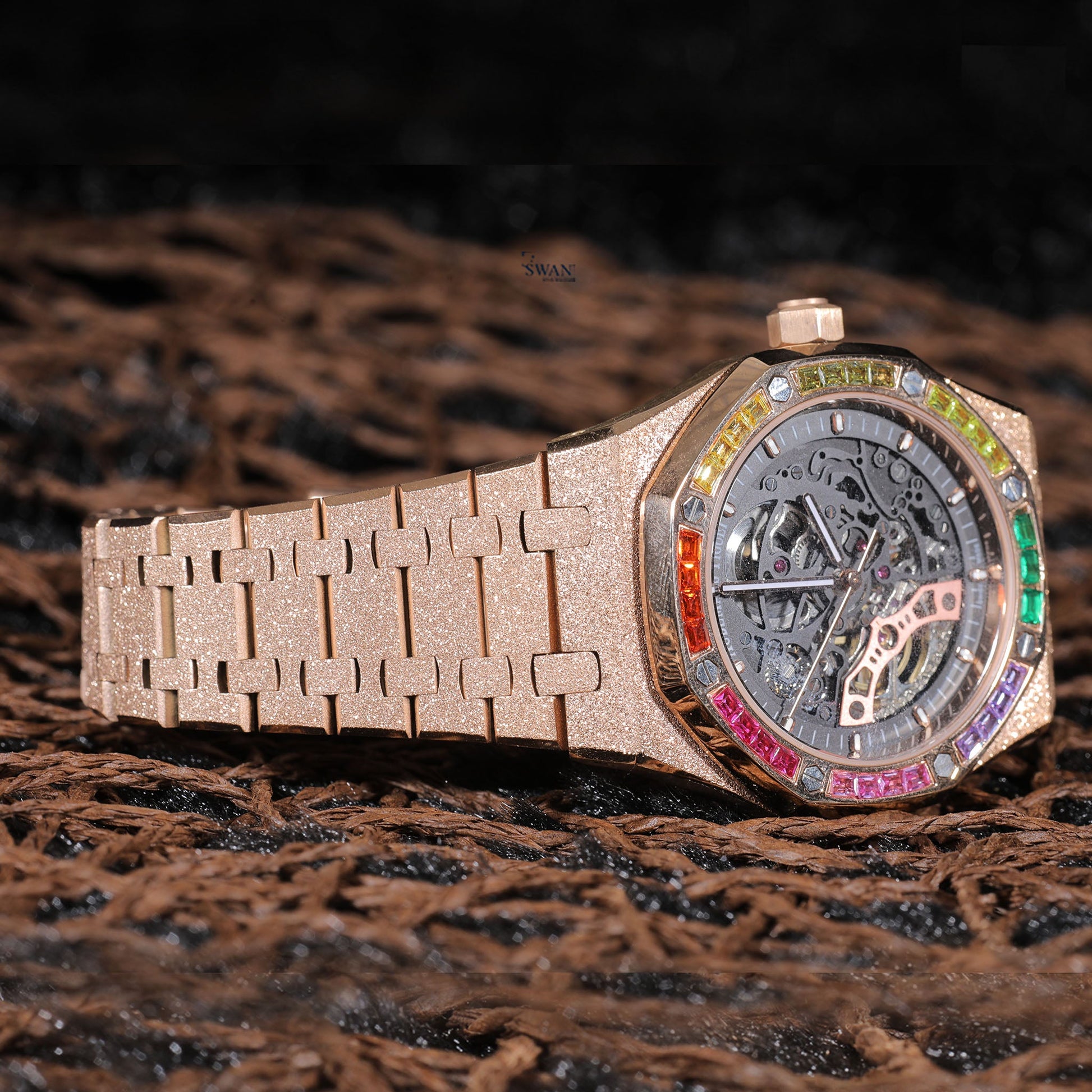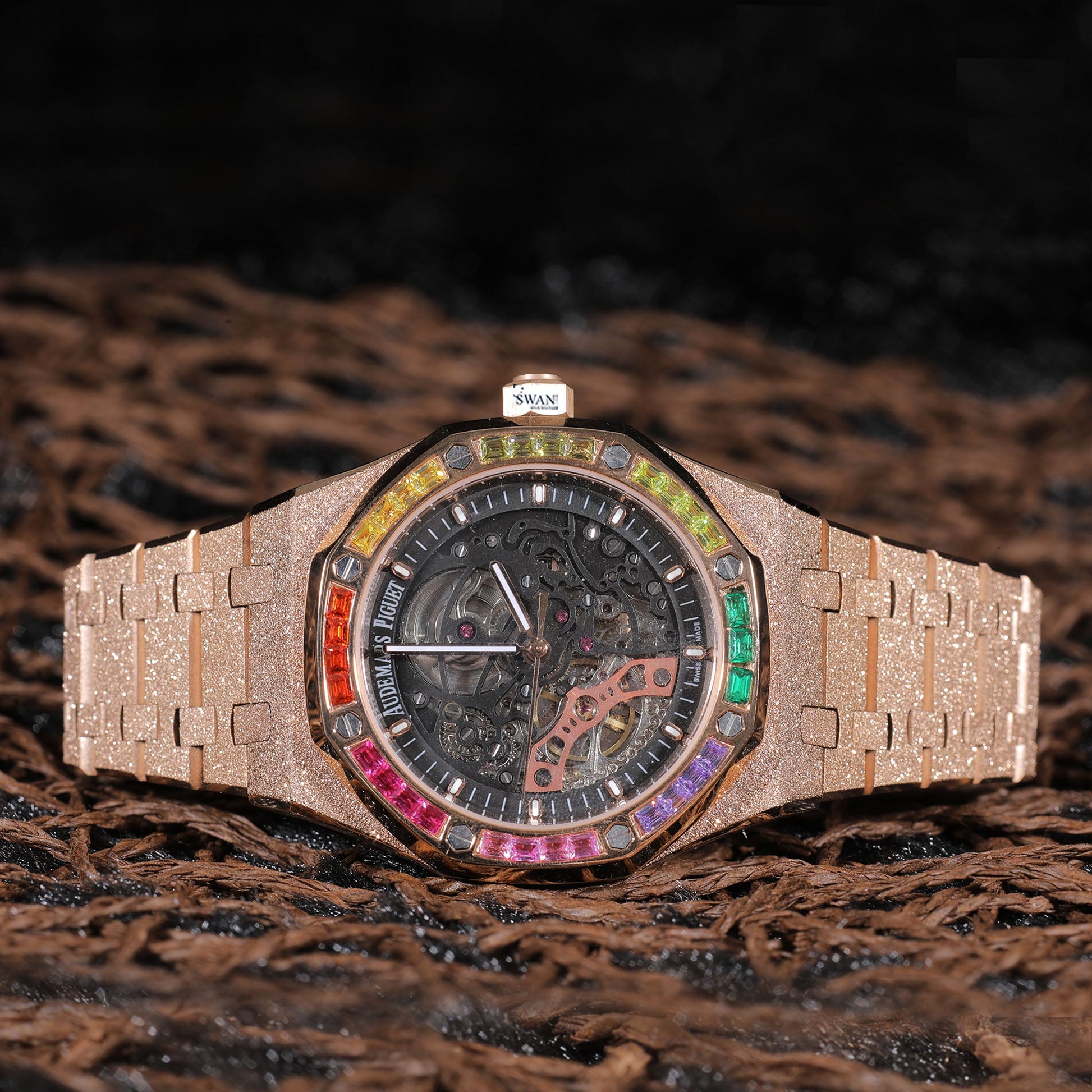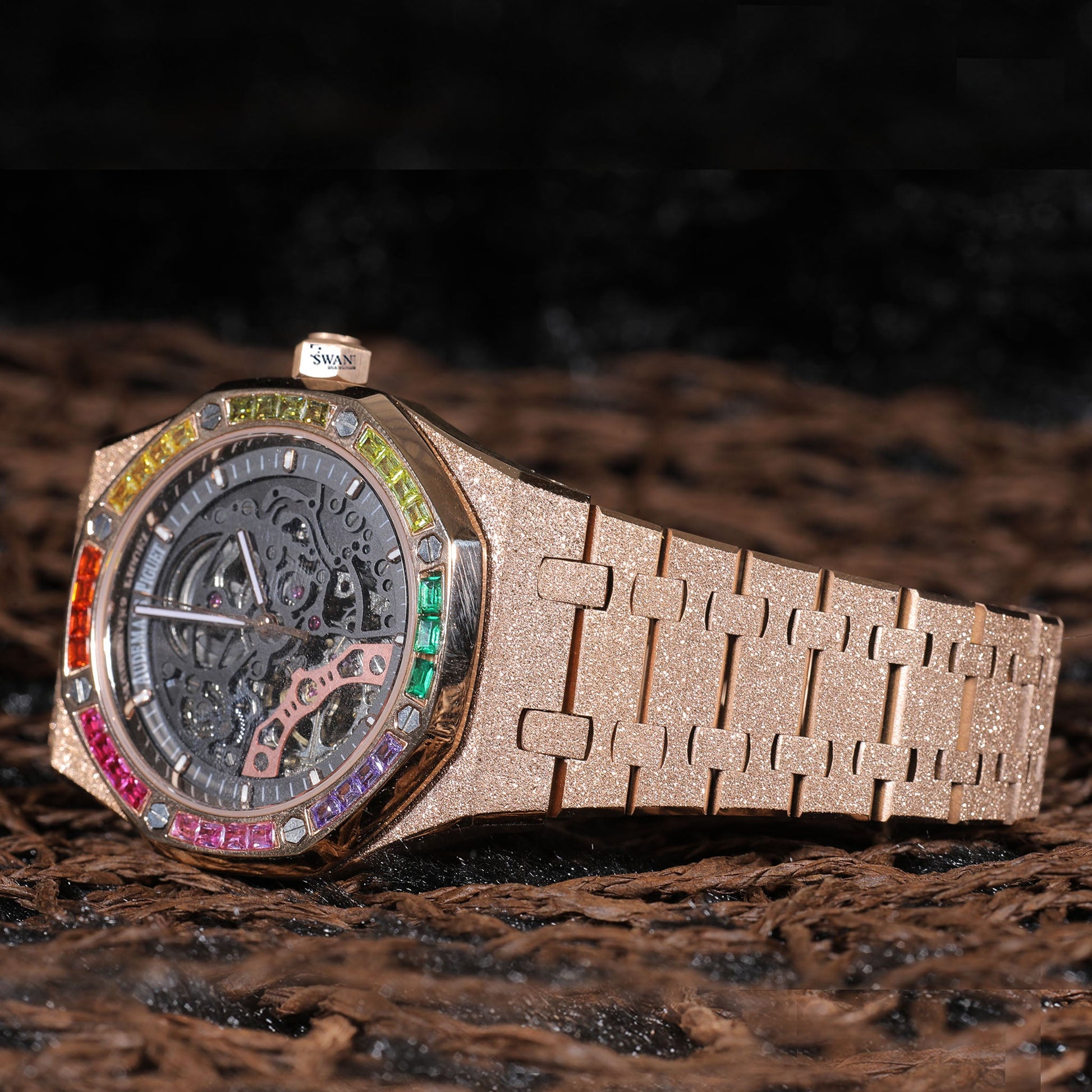 Rose Gold Skeleton Dial Luxury Watch with Rainbow Gemstone Bezel SwanDiamond