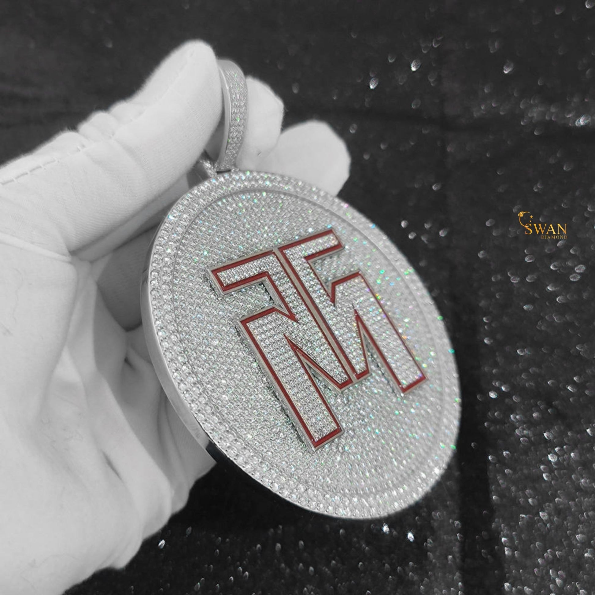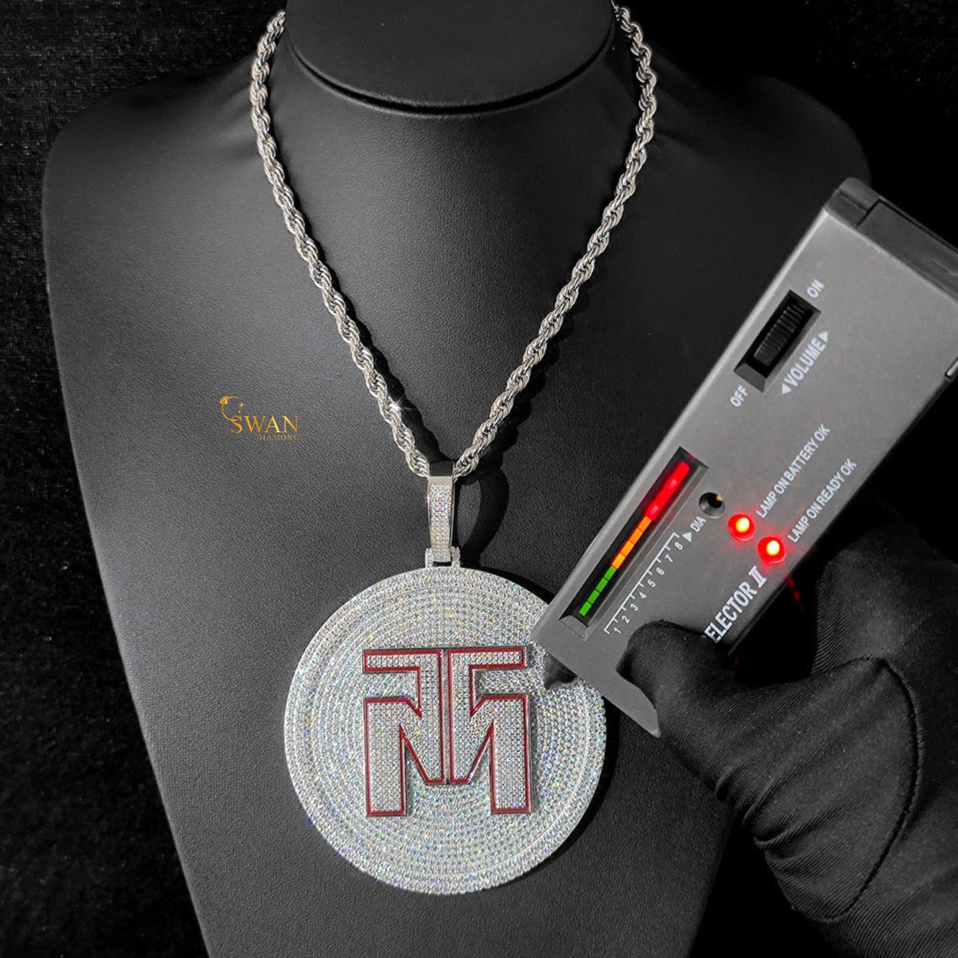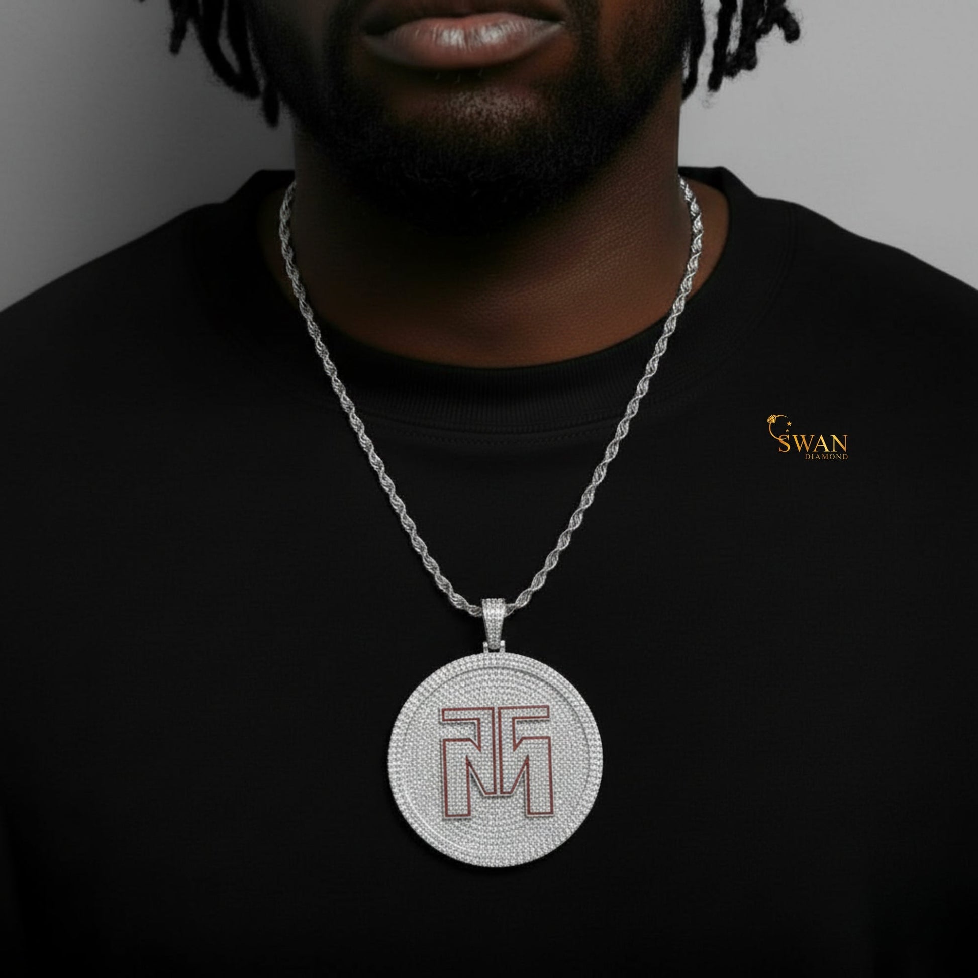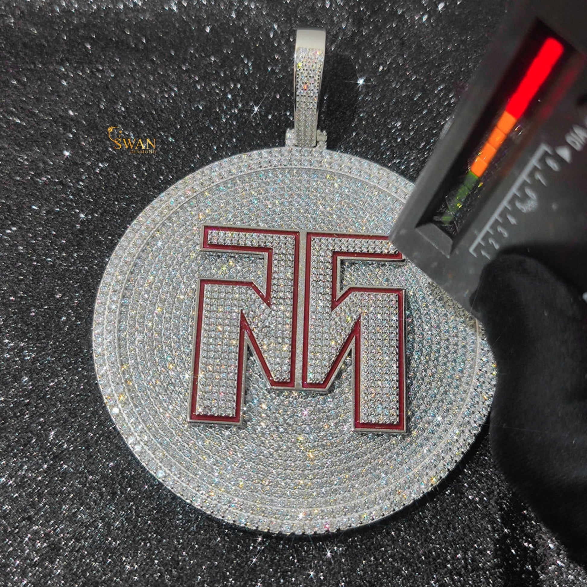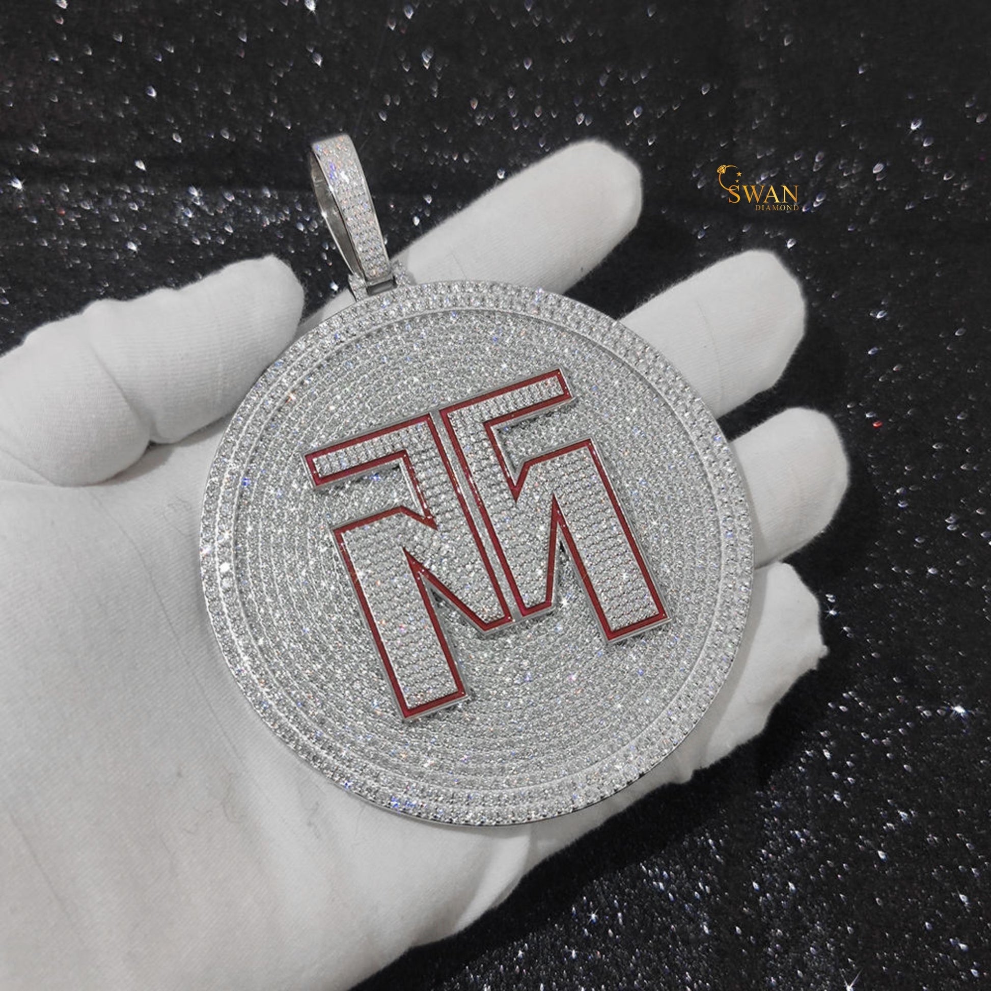 Custom Hip Hop Round Iced Out Pendant with Red Initial Letters Bling Necklace Silver Statement Jewelry for Men swandiamond