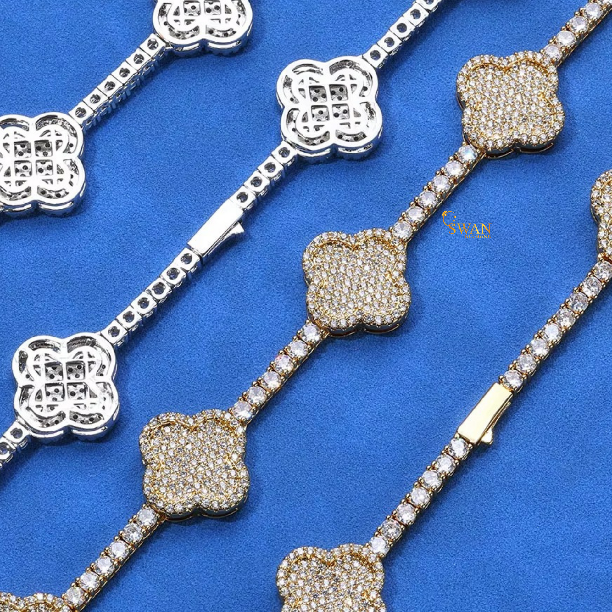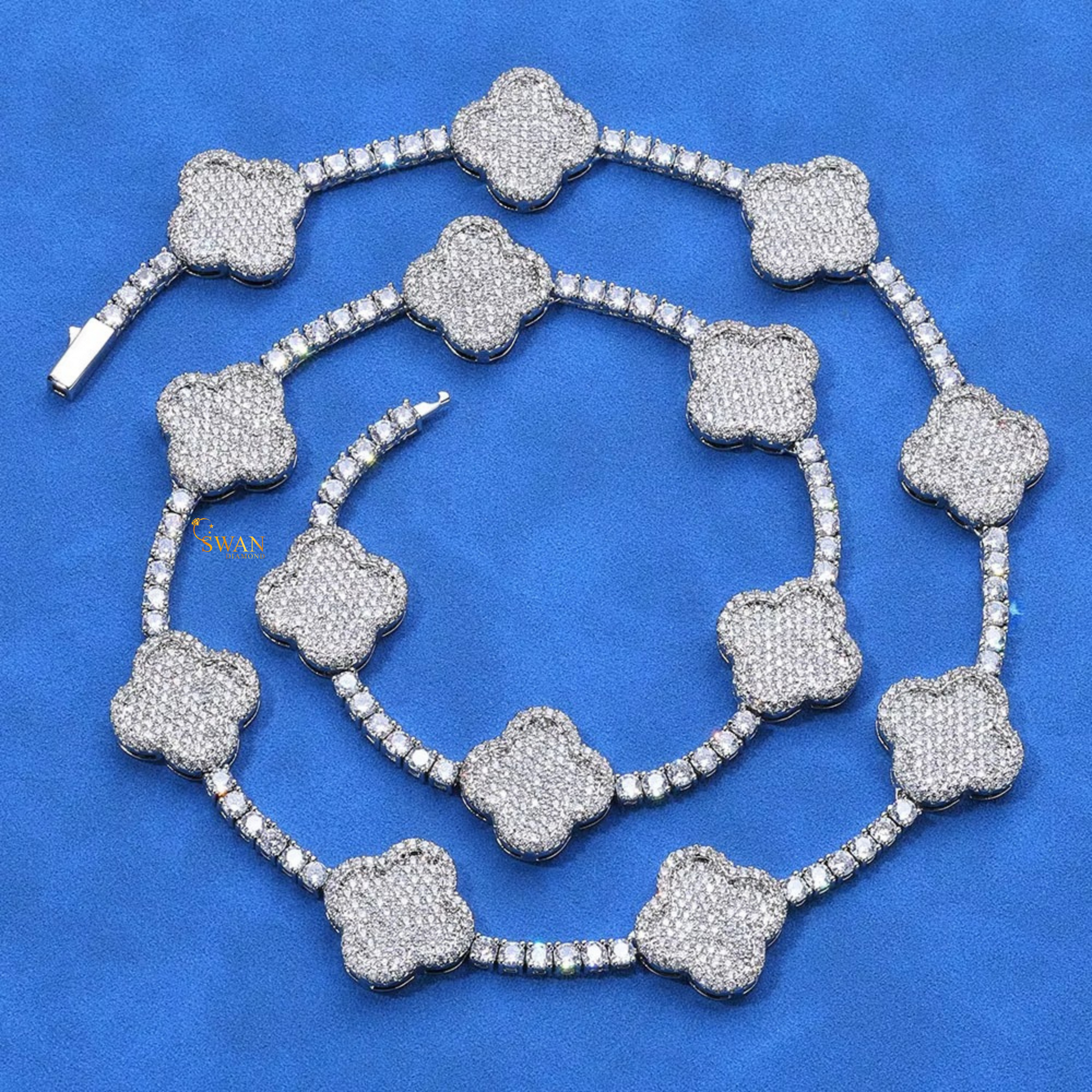 Four Leaf Clover Diamond Tennis Necklace in White Gold with Pave Setting Unique Luxury Statement Jewelry for Men and Women swandiamond
