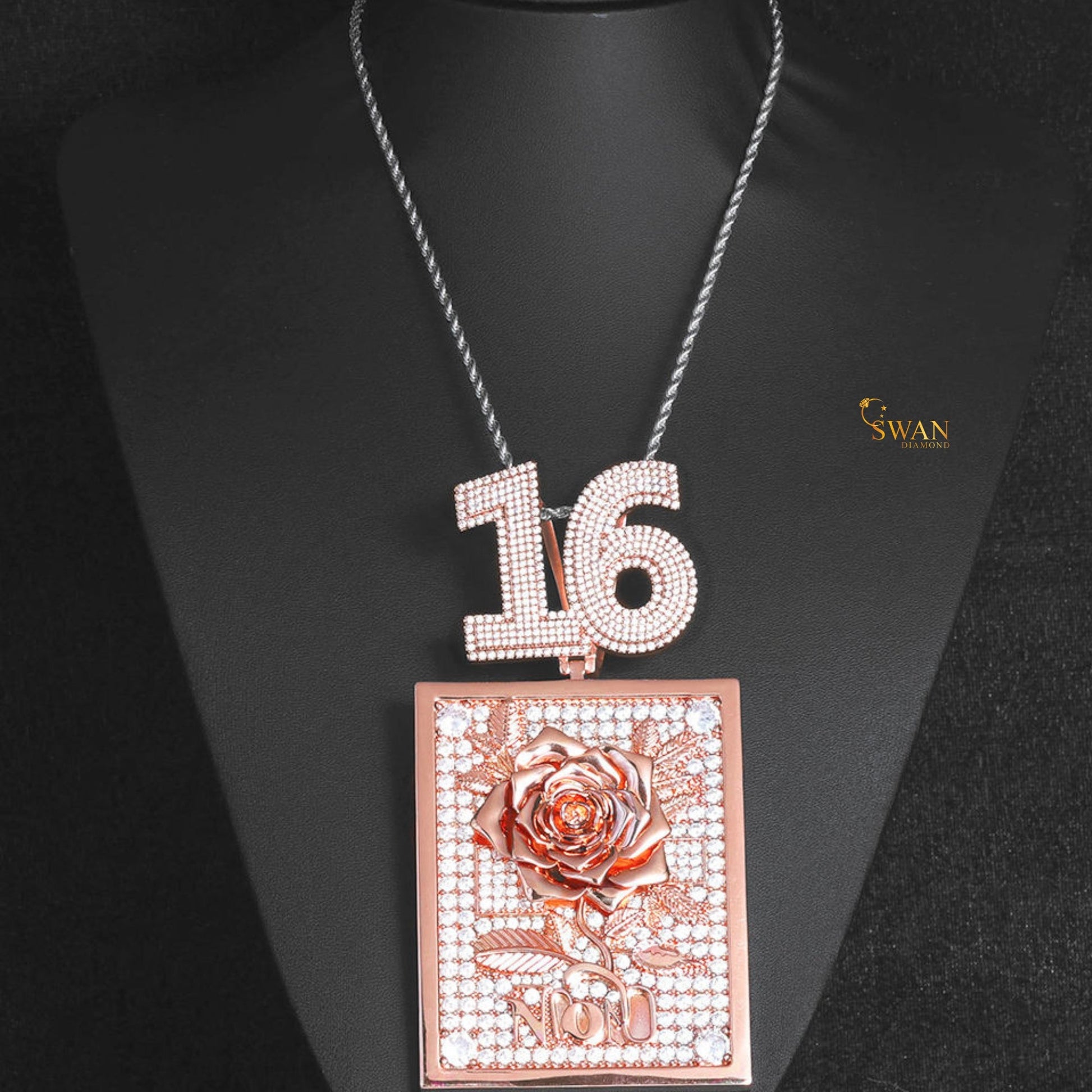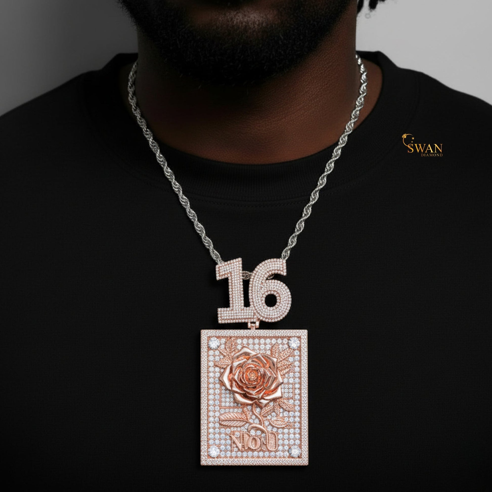 Hip Hop Custom Sweet 16 Rose Gold Pendant with Flower Design Fully Iced Out in VVS Moissanite Diamonds Luxury Necklace for Men swandiamond