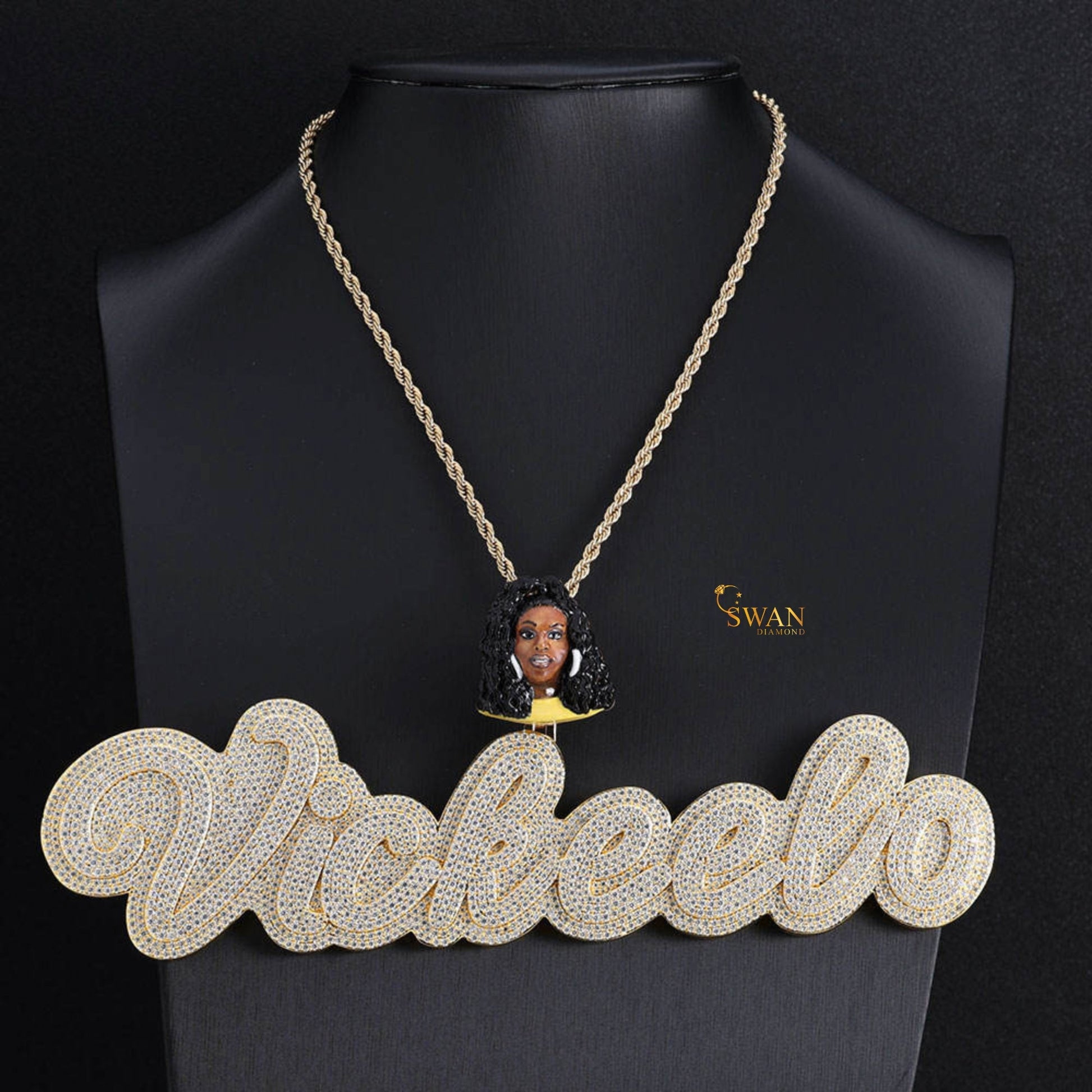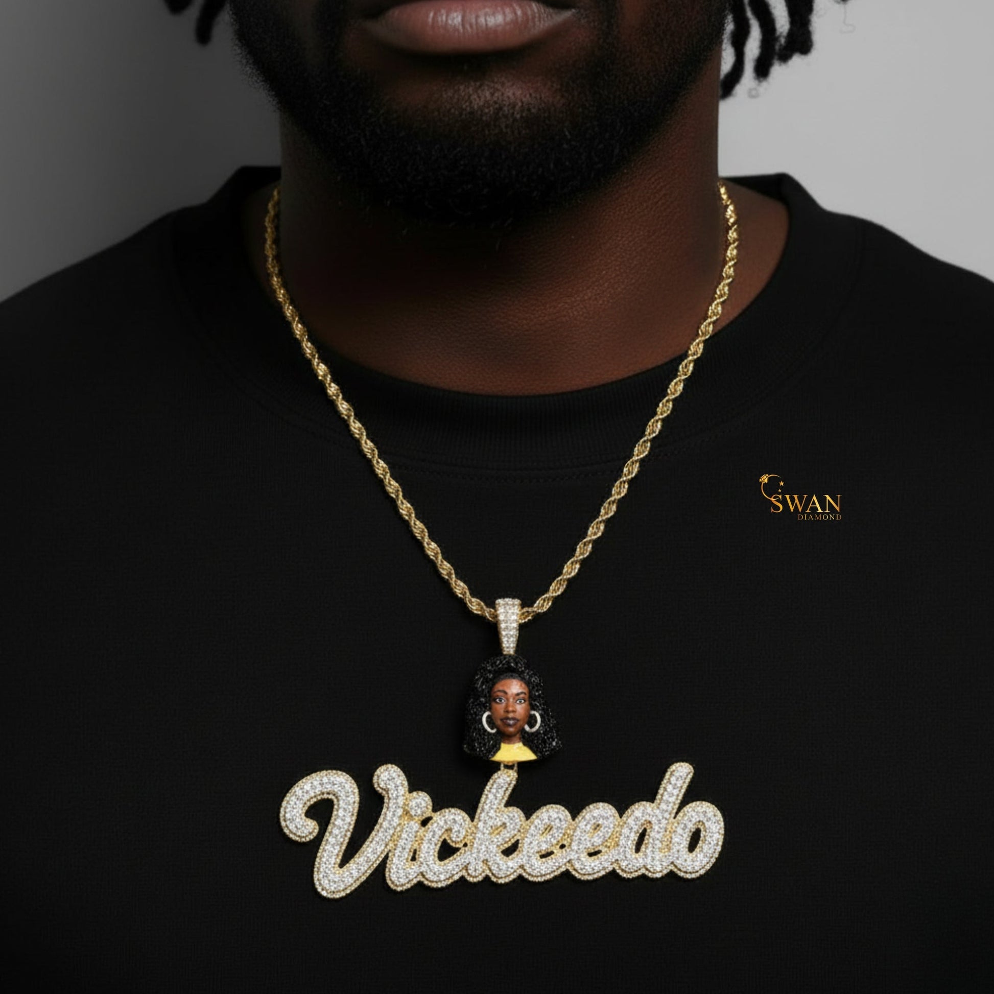 Hip Hop Custom Vickeelo Name Pendant with Portrait Design Fully Iced Out in Gold and VVS Moissanite Diamonds Luxury Necklace for Men Women
