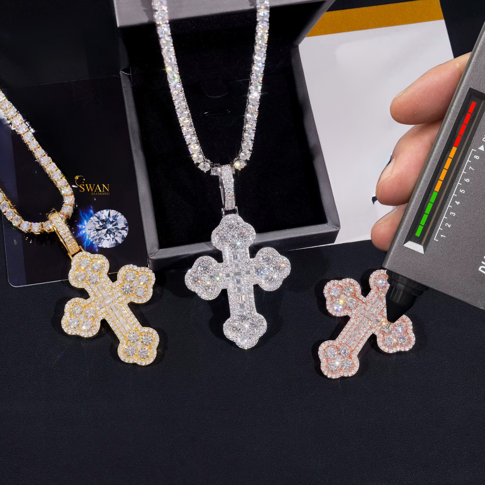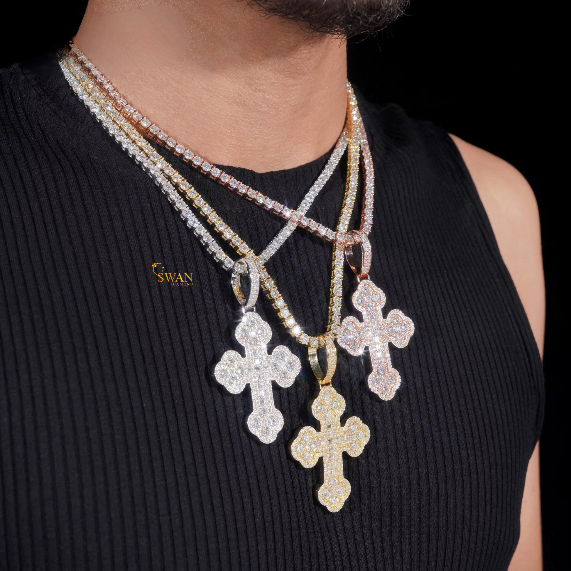Iced Out Diamond Cross Pendant Necklace with Tennis Chain in Rose Gold White Gold and Yellow Gold Hip Hop Religious Jewelry Gift For Men and Women swandiamond