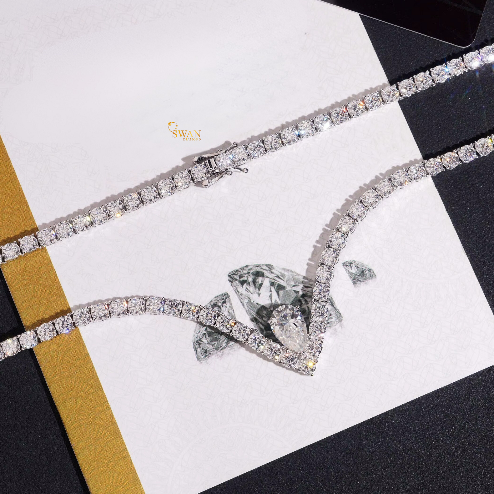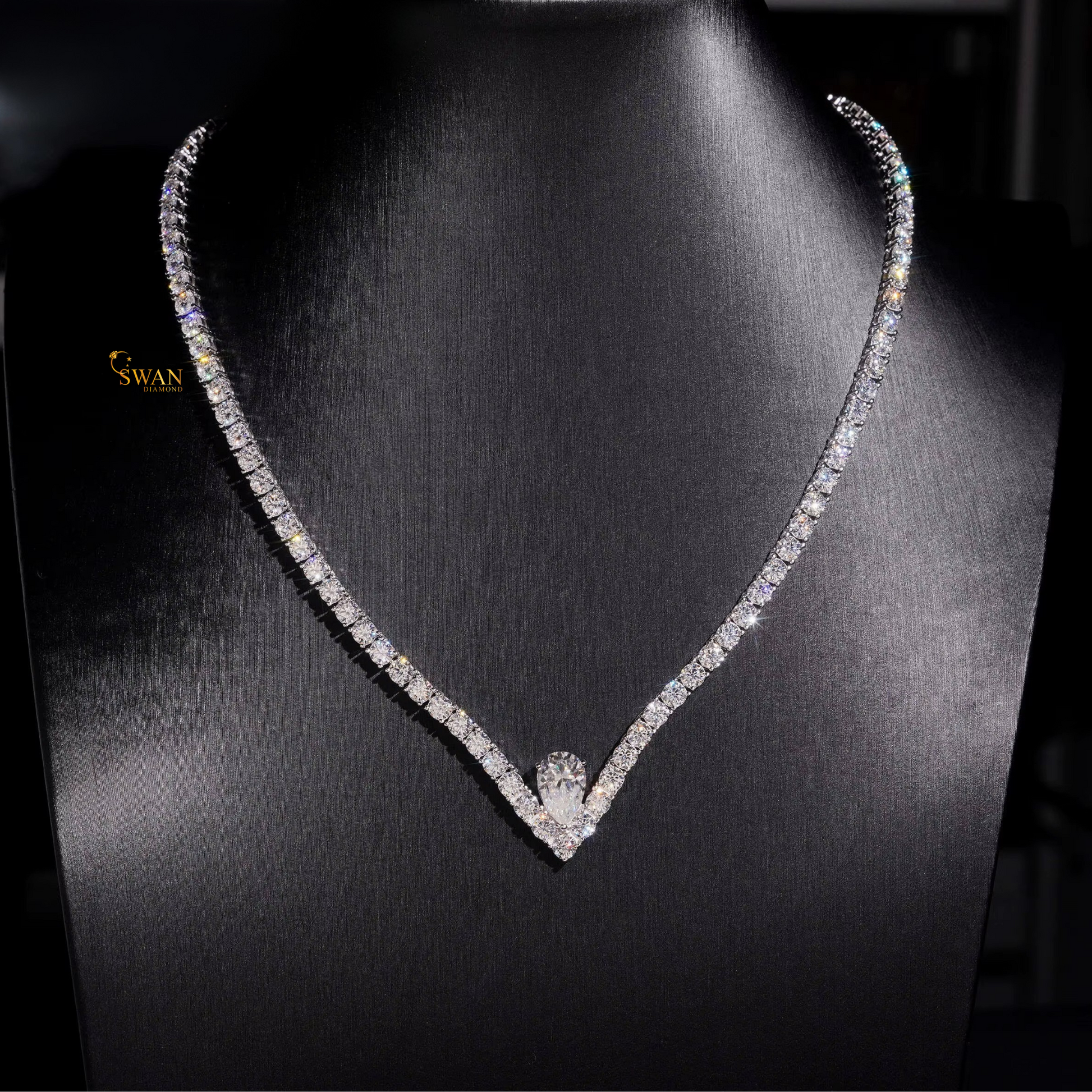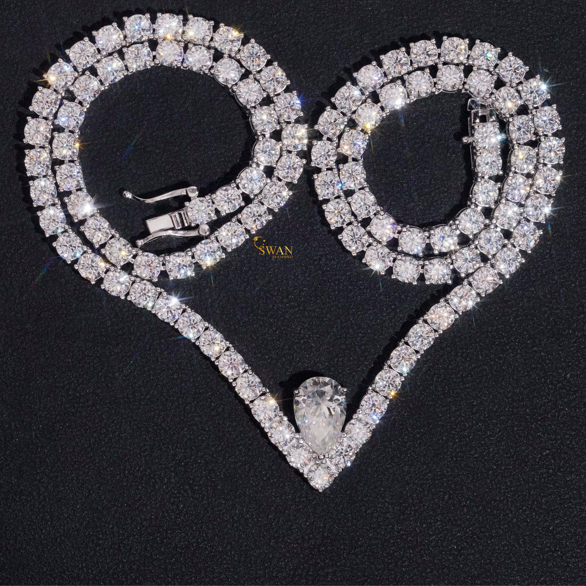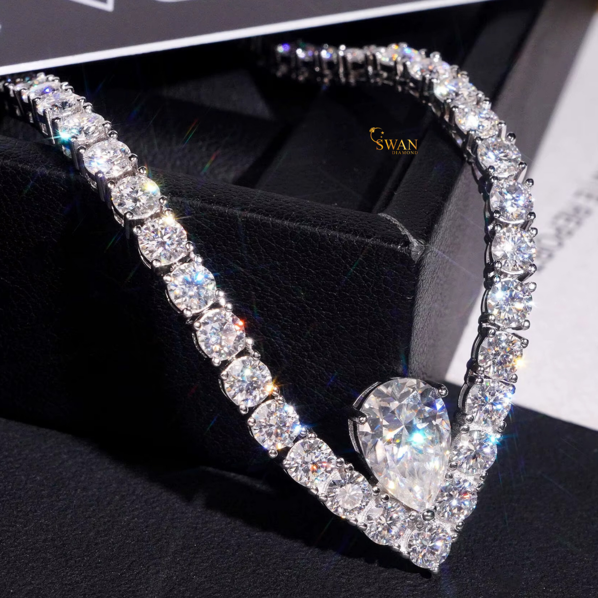 Pear Shaped Natural Diamond Pendant Necklace with Round Diamond Tennis Chain in White Gold Sparkling Luxury Statement Jewelry Gift swandiamond