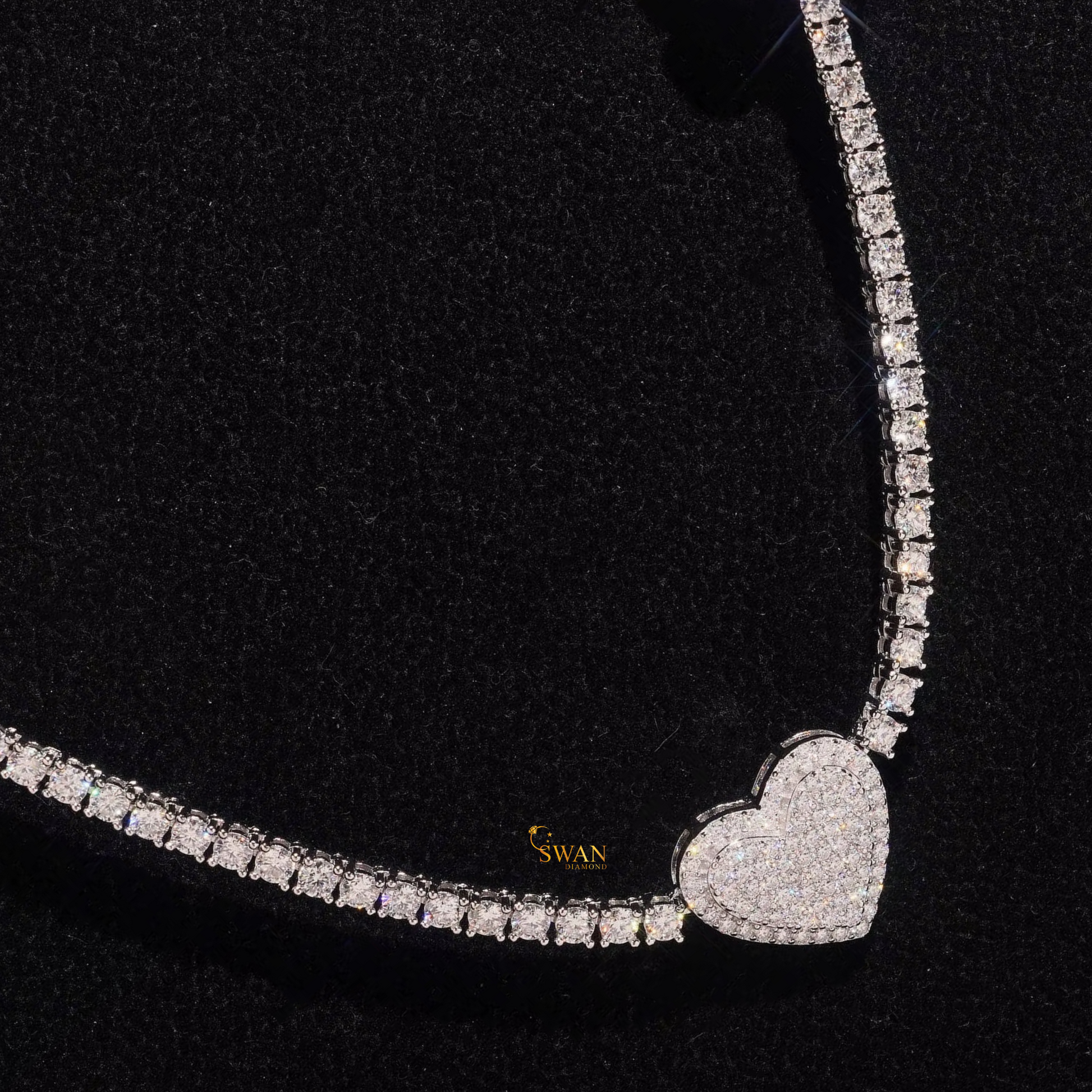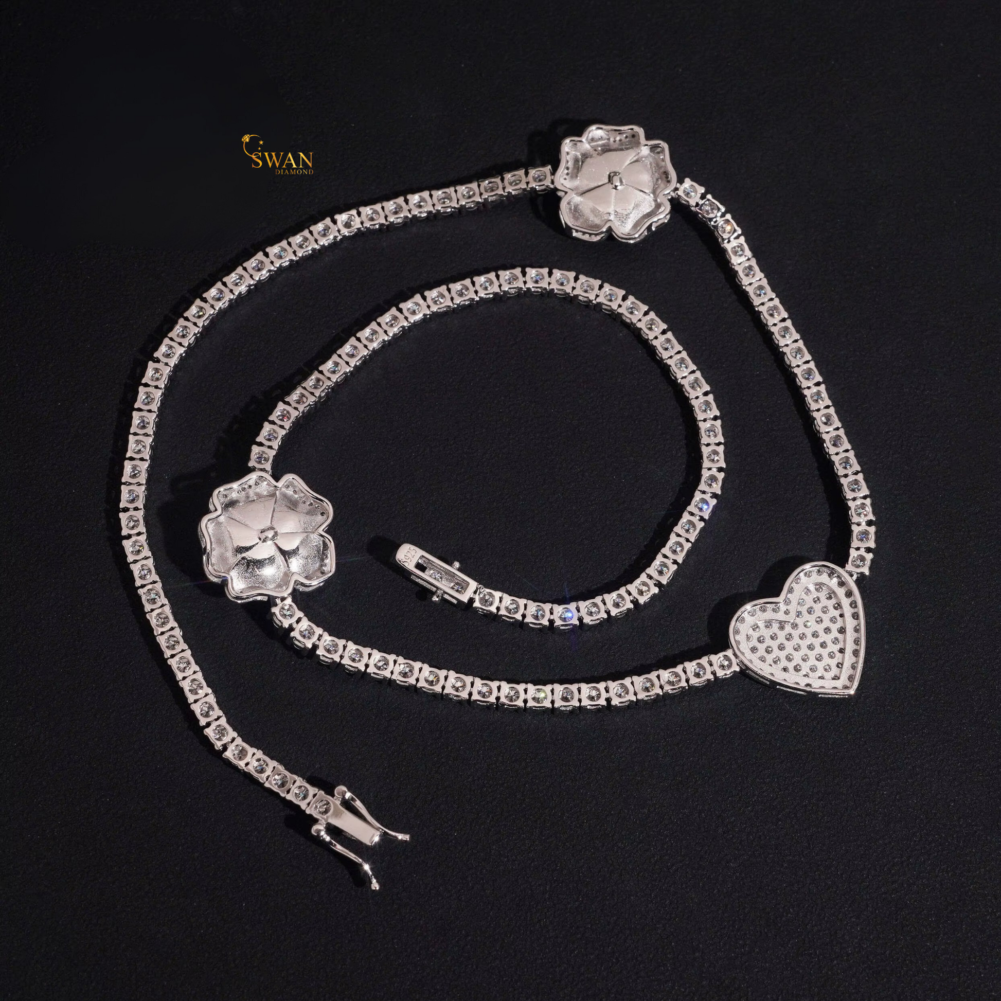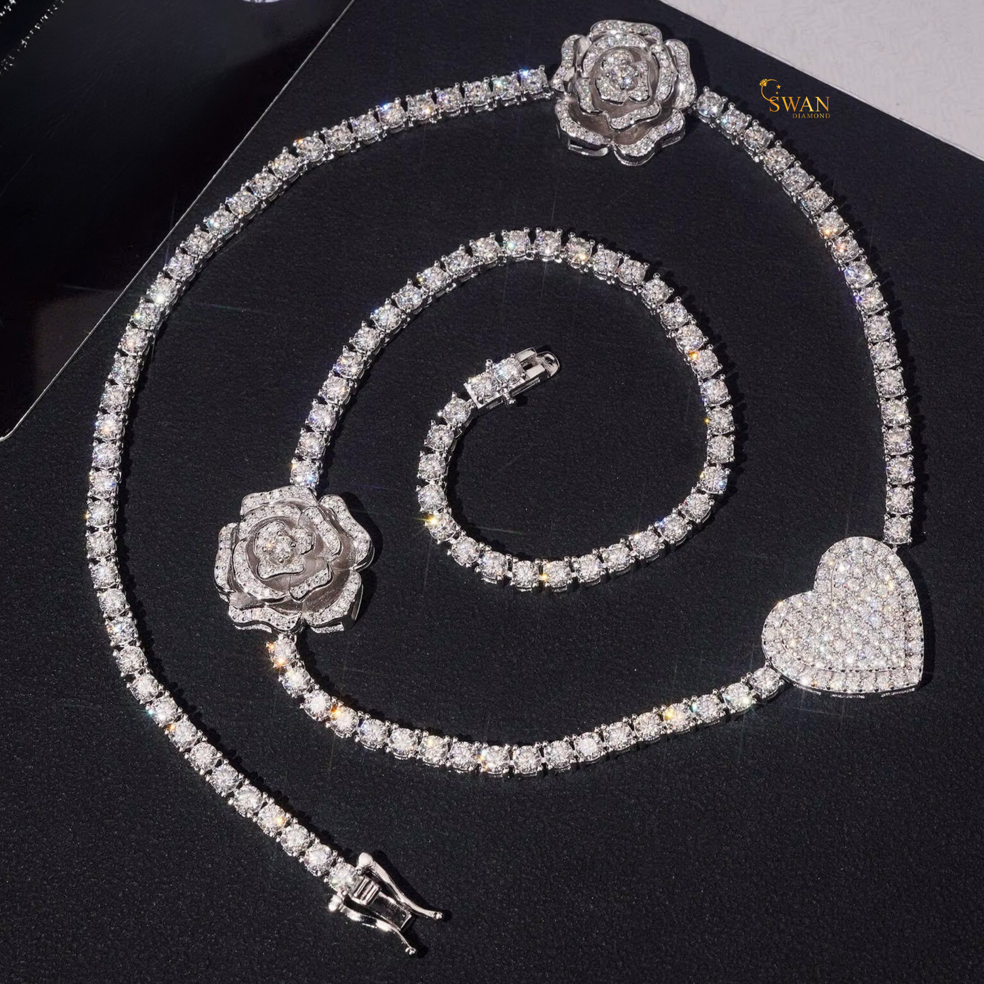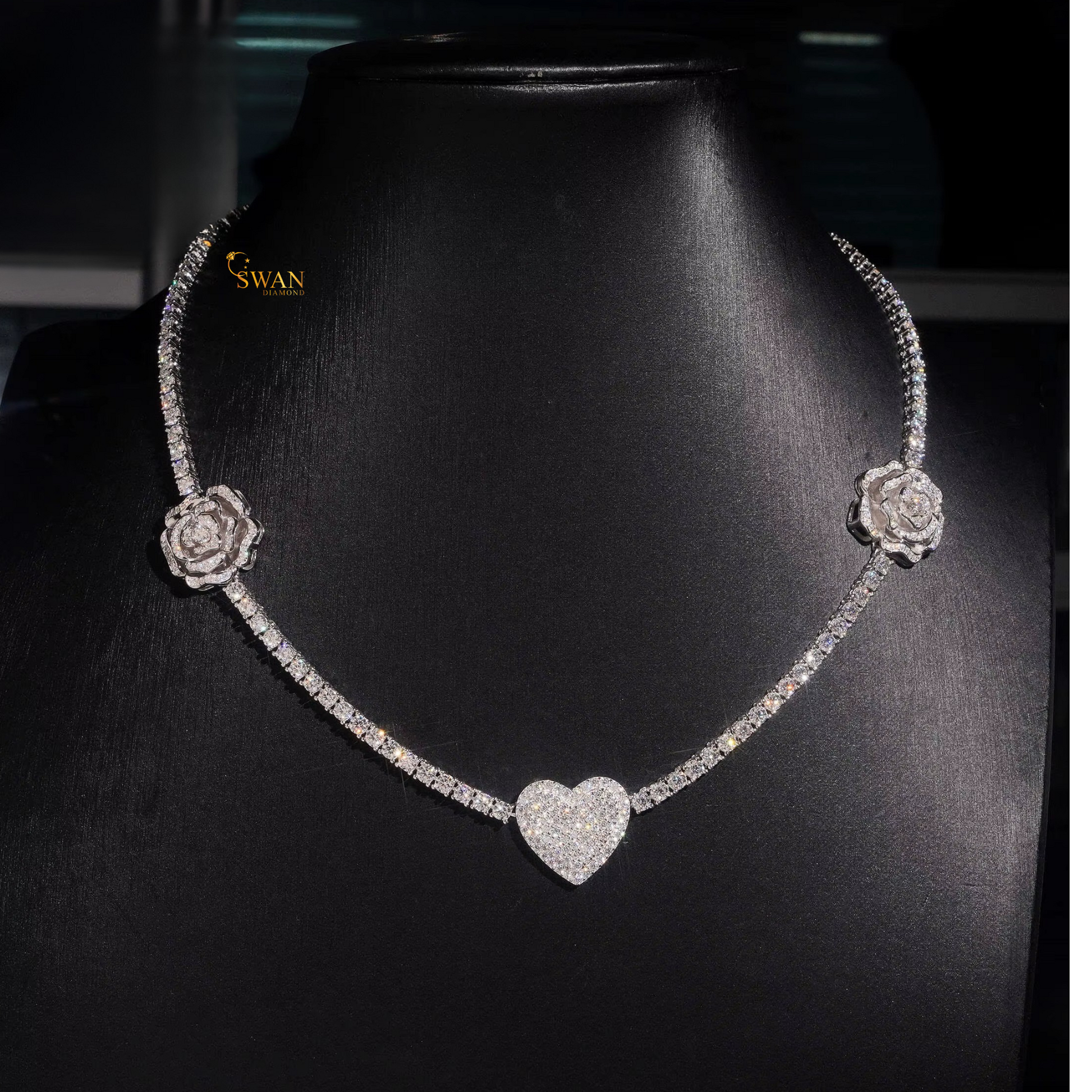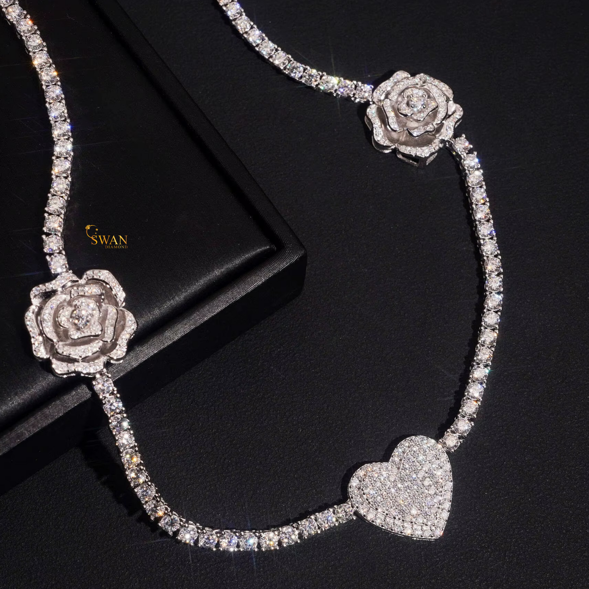 Romantic Heart and Rose Diamond Tennis Necklace in White Gold Luxury Iced Out Jewelry Gift for Women Wedding Anniversary Gift swandiamond