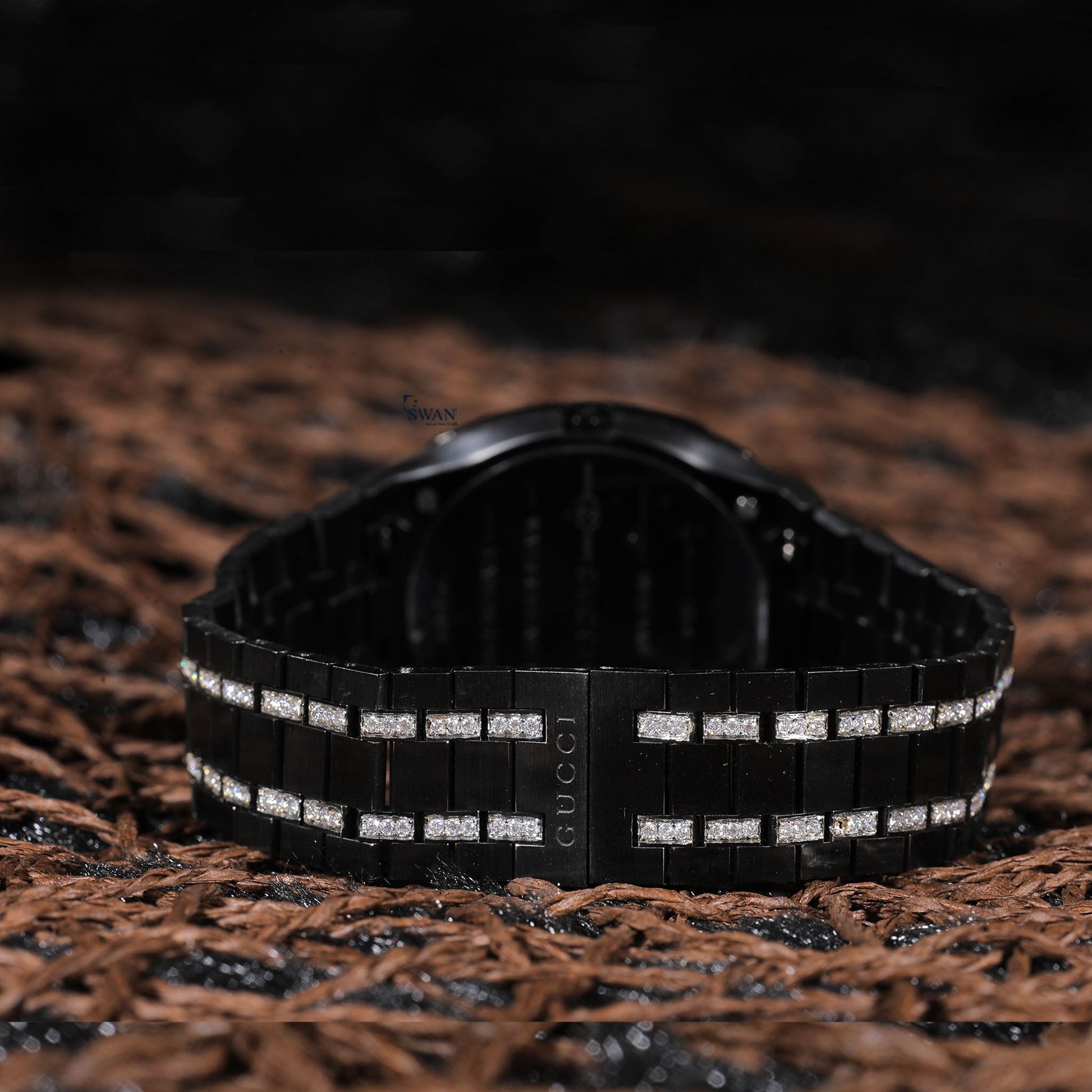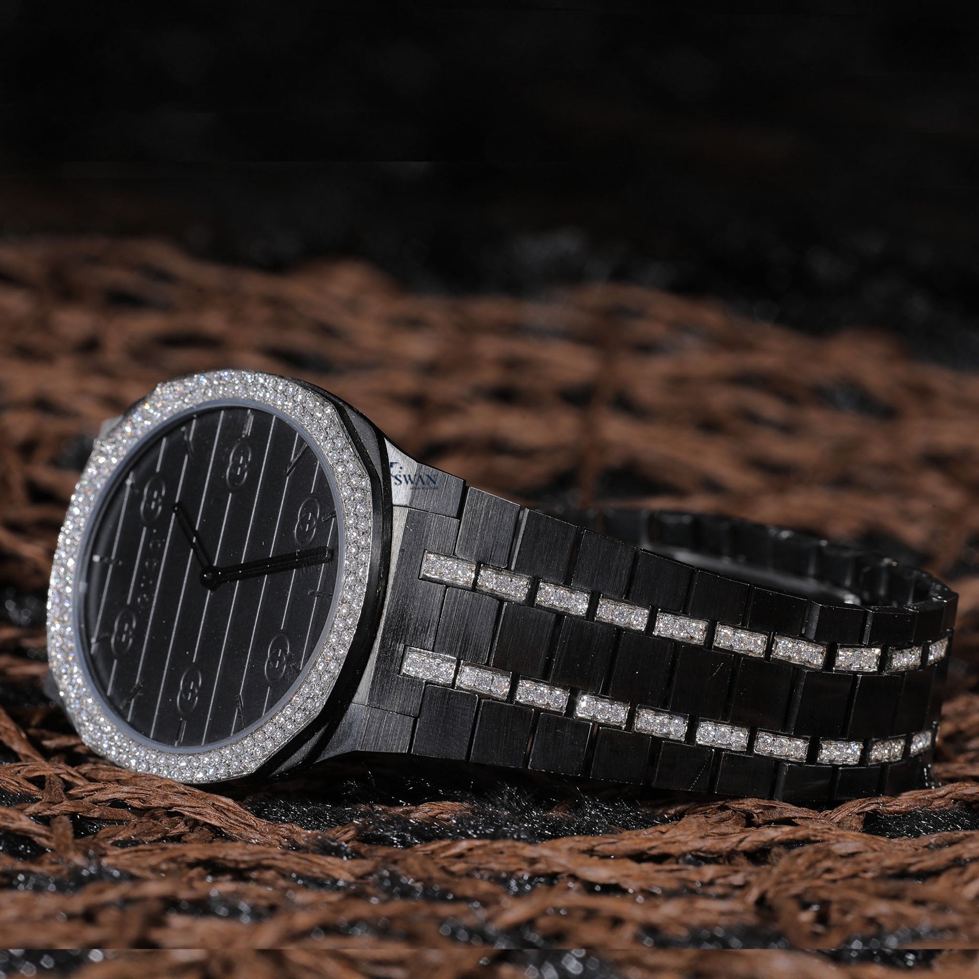 Black Luxury Watch with Diamond Bezel, Pave Link Bracelet, and Sleek Monochrome Dial for Modern Sophisticated Style SwanDiamond