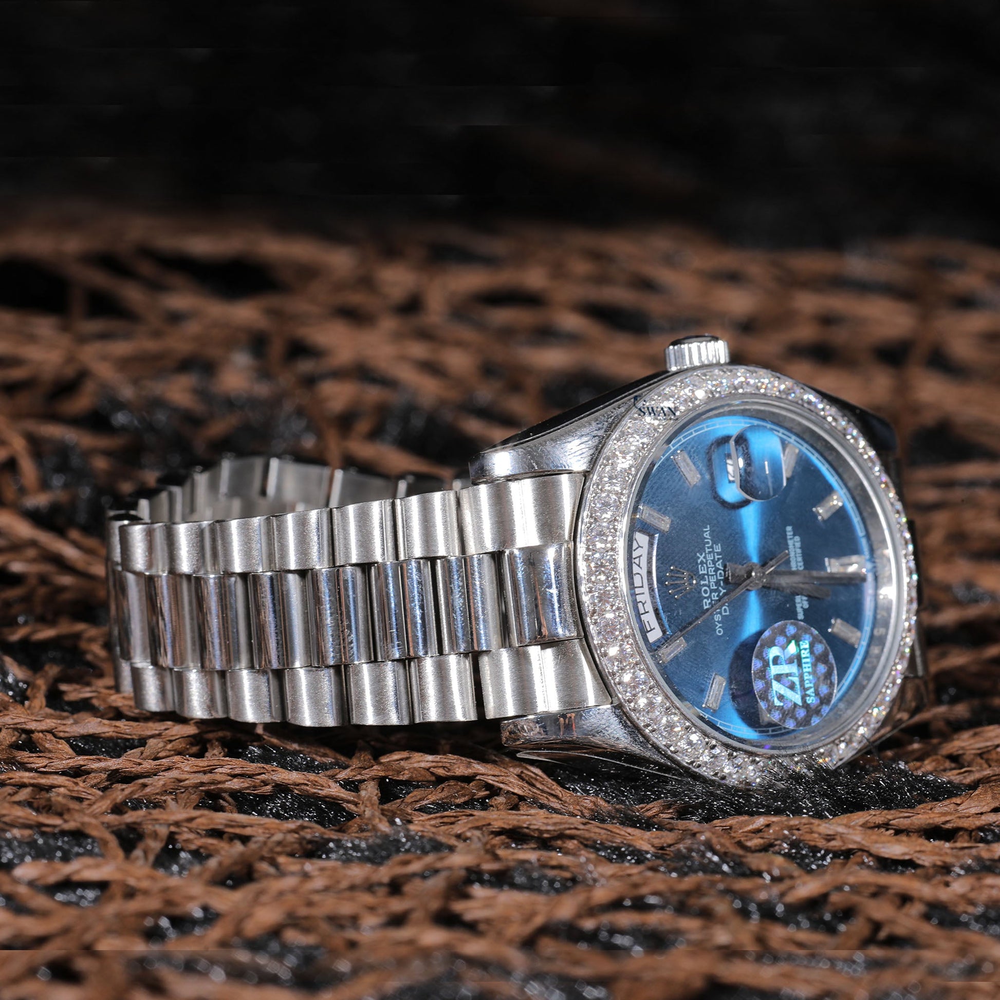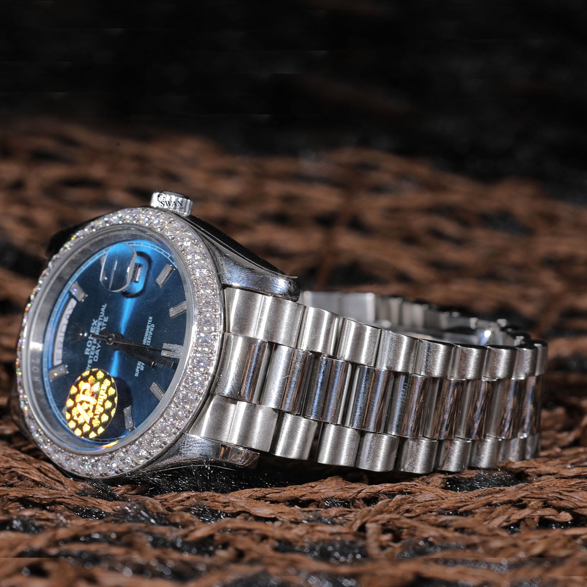 Blue Dial Day-Date Luxury Watch with Diamond Bezel and Stainless Steel Bracelet SwanDiamond