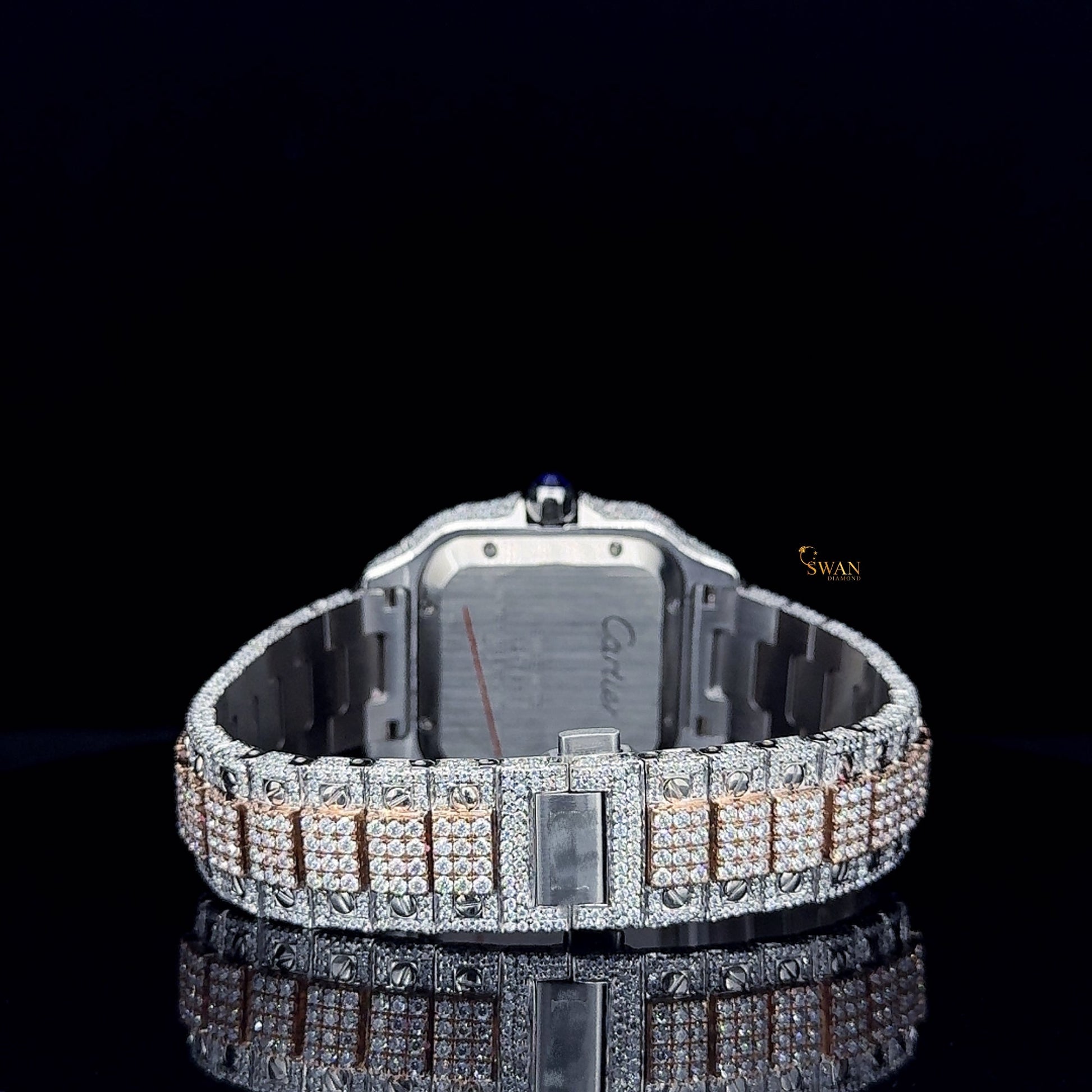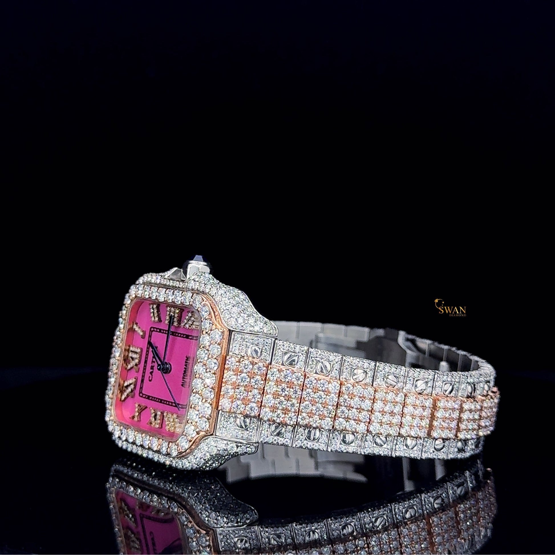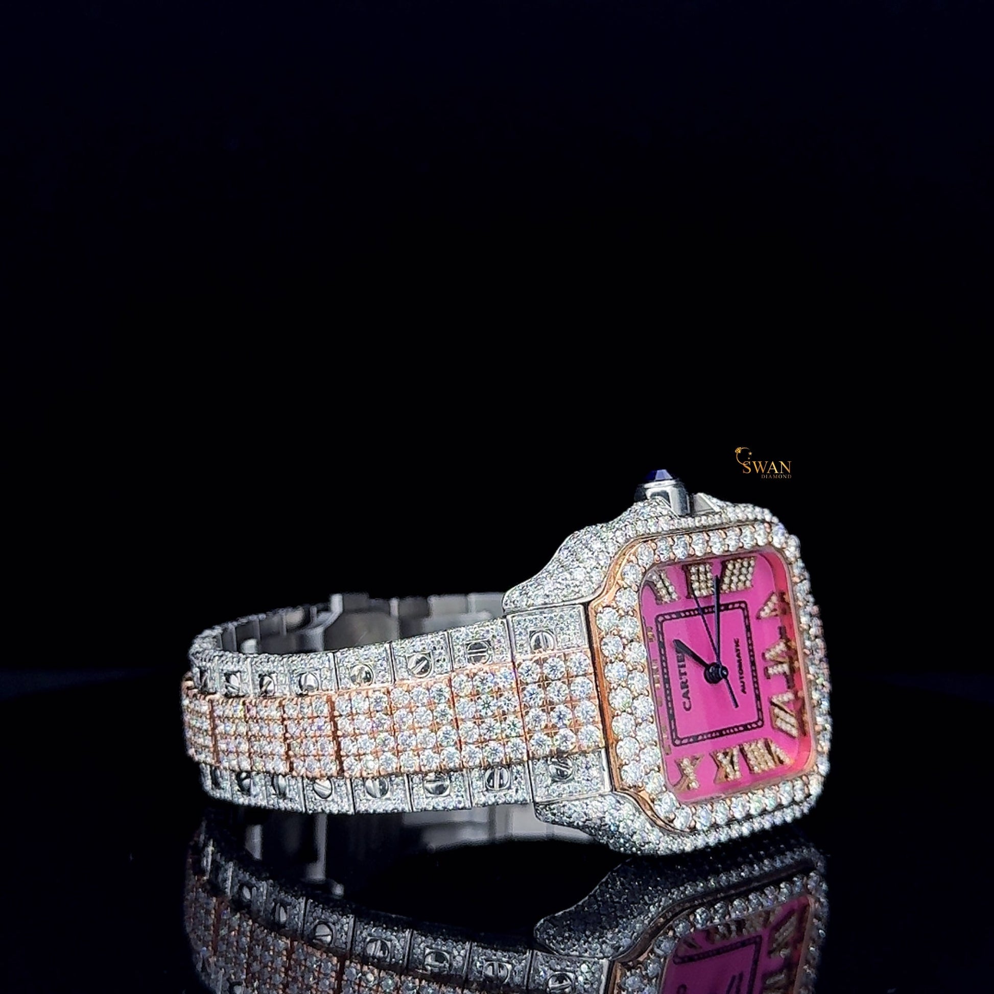 Cartier Santos Iced Out Watch Pink Dial Diamond Roman Numerals Two Tone Rose Gold Bracelet Luxury Custom SwanDiamond