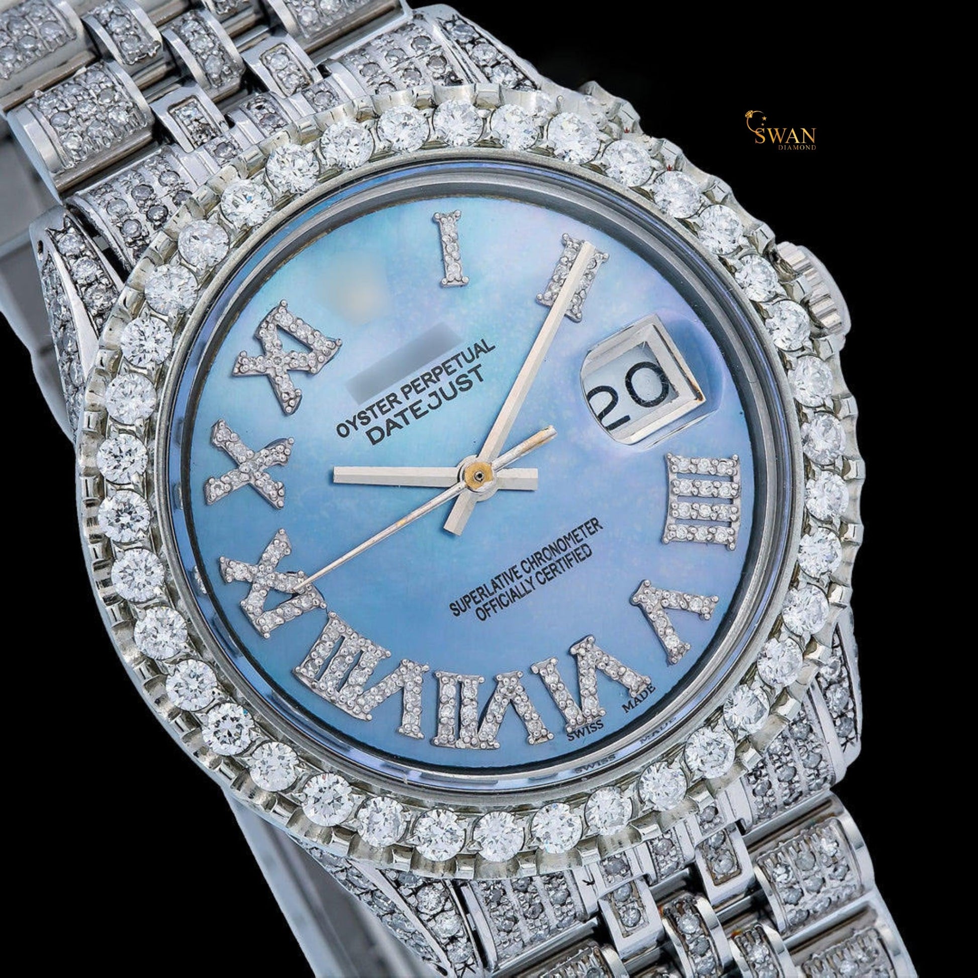 White iced-out watch with a blue mother-of-pearl dial, diamond-studded roman numerals, and a link band by swandiamond